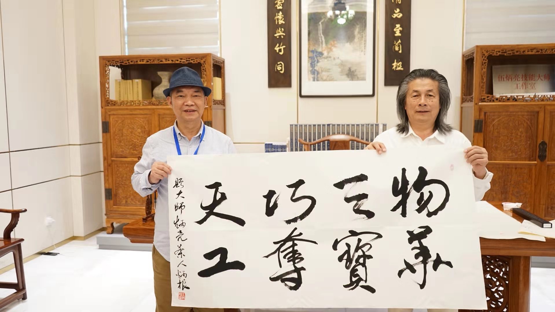 1300餘款伍氏作品在青磚黛瓦、歇山頂、重檐、迴廊、月洞門、小橋流水、盆景以及庭院的烘托下,於疊景、借景、留白等手法中,以一種微妙的互動關係向世人解讀當下該如何傳承、弘揚中國傳統文化這一宏大命題。在鎮館之寶海南黃花梨處,作家們細細品味,讚嘆不已。手指輕扣帶着歷史韻味的舊傢具,衣向東讚歎道,「肯定是從民間收藏來的,真是好東西。」王炳根則給予了「物華天寶,巧奪天工」的高度讚譽。水運憲也用自己的座右銘「作品說話,人品立身」贈予伍炳亮。