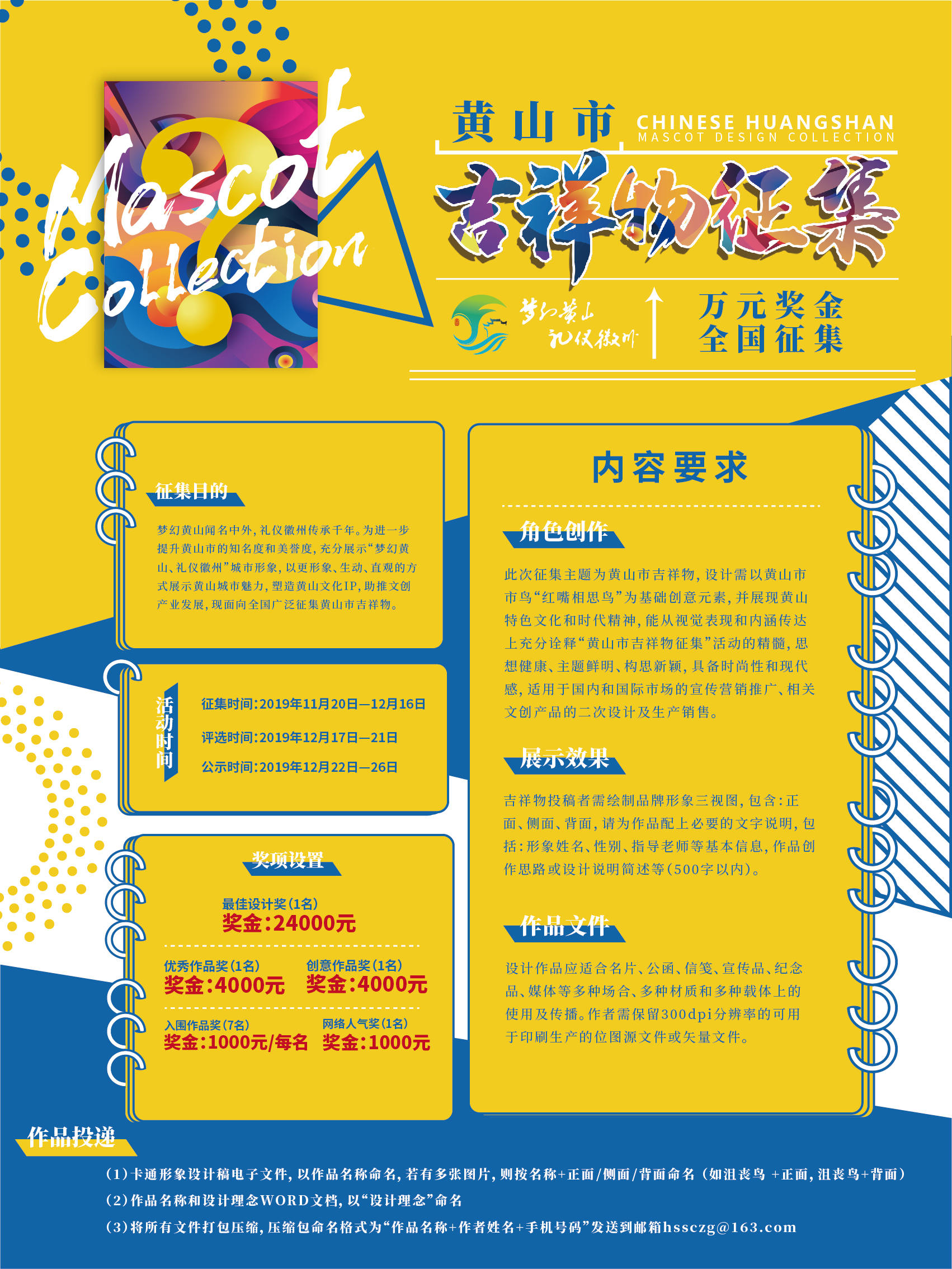 黃山市吉祥物徵集郵箱為:hssczg@163.com,發佈會時間定在黃山市文投集團全資子公司黃山市城市展示館運營管理有限公司註冊成立3周年之日,即2020年1月5日,場地設在黃山市城市展示館中庭,現場通過發佈會暨第五屆國際少兒模特明星盛典黃山賽區決賽(120位潮童走秀)的形式展示11個類別、200餘件獲獎作品的衍生產品。