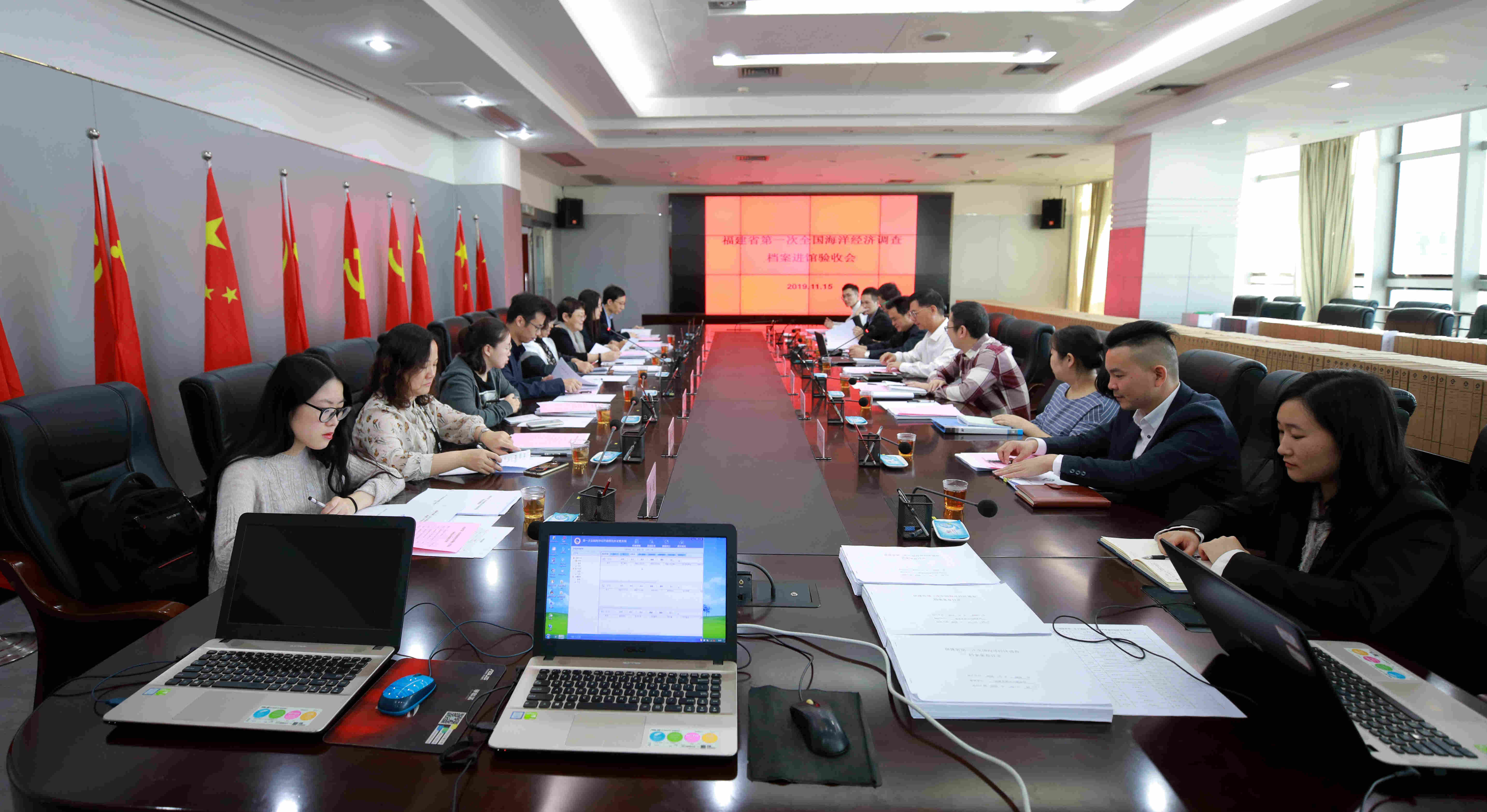 會上,專家驗收組聽取了福建省第一次海洋經濟調查工作領導小組辦公室(以下簡稱“福建省調查辦”)的檔案工作情況彙報,查驗了檔案實體,認為福建省“第一次全國海洋經濟調查”檔案管理組織到位,建立了健全的省級檔案管理制度和規範,有效開展了檔案業務培訓和品質把關工作,保證了檔案工作的順利實施。檔案檔較齊全完整,歸檔檔分類準確,元件組卷合理,電子檔和照片檔案整理規範,符合《第一次全國海洋經濟調查檔案管理技術規範》要求。經研究討論,專家驗收組一致同意福建省“第一次全國海洋經濟調查”檔案工作通過驗收。