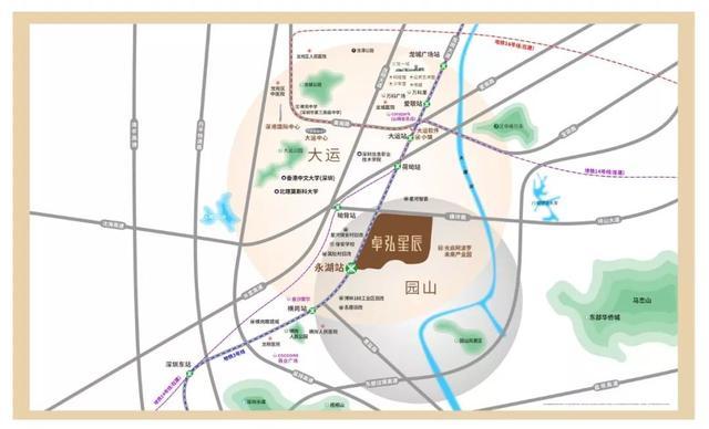 卓弘星辰位於城市主幹道龍崗大道旁,出門即是永湖站A2地鐵口,享龍崗重點片區大運新城、園山片區雙重利好。其中園山片區有著優異的自然稟賦,環繞三山兩水自然資源(梧桐山、桐基山、園山、大康河、梧桐山河),也是全區山林面積最大的片區之一,在繁忙都市生活之下,其居住優勢盡顯。