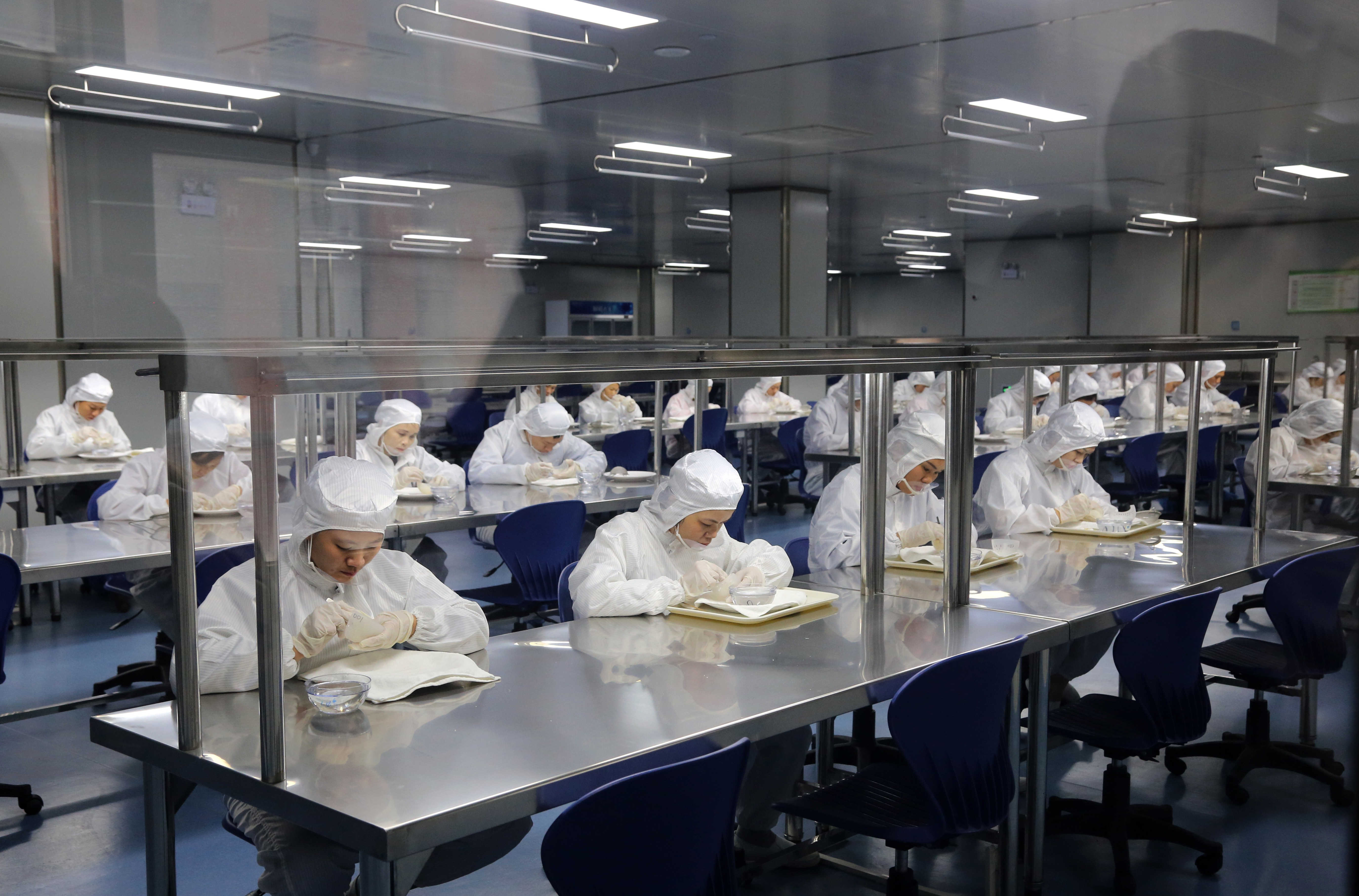 工人在毛燕加工廠房進行燕窩生產加工(林農/攝)
