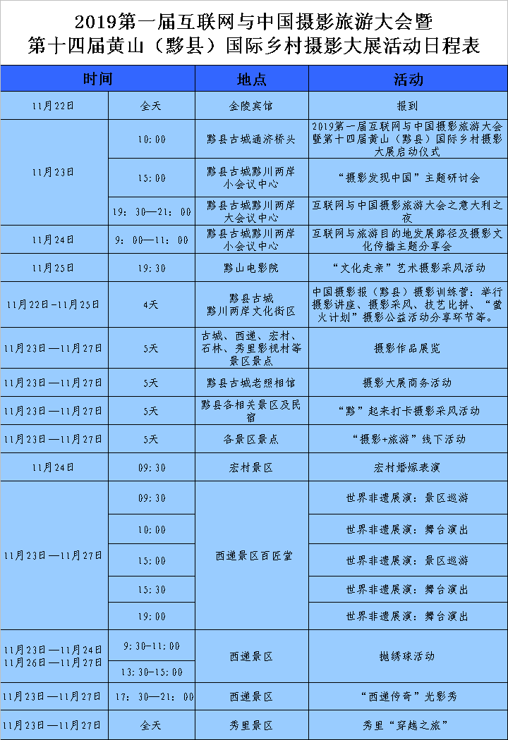 啟動儀式於11月23日上午10:00於黟縣古城通濟橋頭舉行,將進行”中國攝影培訓基地“授牌、1+3品牌榜單發佈及頒獎、黃山市、黟縣2019攝影大展獲獎作品頒獎以及攝影打卡地排行榜發佈。本屆攝影大展將展出7000餘幅作品,包括一帶一路沿線國家攝影旅遊目的地攝影展、網路攝影觀念展、攝影發現中國、互聯網矩陣影像聯展等主題展。
