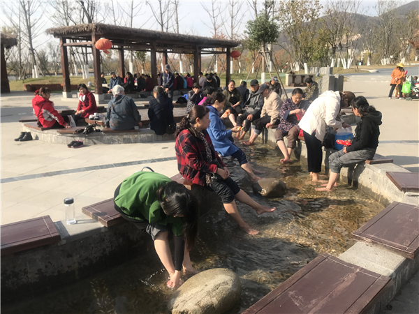 金烏溫泉公園內,市民們正在享受免費足湯