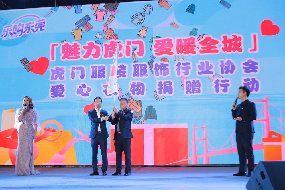 為結合東莞全市的「樂購東莞 愛暖全城」主題活動,虎門充分發揮虎門服裝產業優勢資源,啟動儀式上,虎門政商企聯手共同發起「魅力虎門 愛暖全城」活動,向慈善機構捐贈愛心衣物(10000件),希望通過一件件衣服承載的愛心,傳遞溫暖真情。