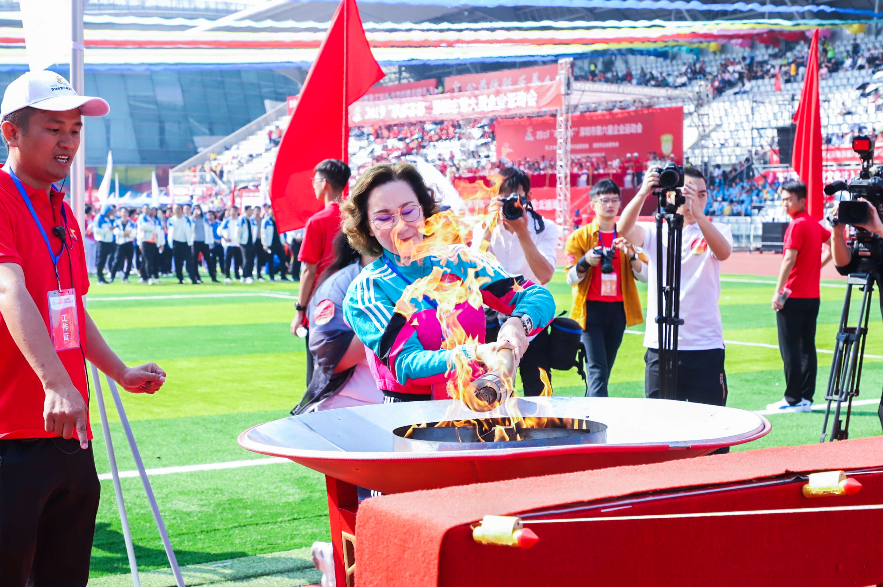 【香港商報網訊】記者 蘇偉 報導:為進一步貫徹國務院《全民健身條例》,廣泛宣傳《深圳經濟特區促進全民健身條例》,積極回應深圳市“全民健身月”活動11月24日,由深圳市企業聯合會、深圳市企業家協會(以下簡稱深圳企聯)主辦的2019“豐源芯杯”深圳市第六屆企業運動會在深圳市福田區體育公園隆重舉行。深圳市老領導張寶琴、許揚,全國政協委員、深圳企聯會長、正威國際集團董事局主席王文銀,深圳市總工會黨組成員、副主席古成,深圳企聯功勳會長王殿甫、執行會長于劍、常務副會長王志國、執行副會長兼秘書長康永魁、執行副會長唐毅輝,運動會資助單位、深圳市文化廣電旅遊體育局群眾體育處副處長張文造與運動會總冠名單位、深圳市豐源芯科技產業控股有限公司總裁馬小秋,運動會承辦單位、深圳市五環體育集團董事長陳建榮,深圳市星銀醫藥有限公司總經理田偉琴、東鵬陶瓷有限公司總經理羅茂元、深圳市水務(集團)有限公司黨委副書記何春華、中裕冠集團百歲健康酒業總經理劉漢璽、深圳市威豹金融押運股份有限公司董事長胡可、深圳市燃氣工程有限公司董事長劉一川等100多名企業家出席運動會。深圳市總工會黨組成員、副主席古成宣佈運動會開幕。40多家企業組成的入場方陣精彩亮相,100多家企業2000多名運動員參賽,5000多觀名現場觀看開幕式。