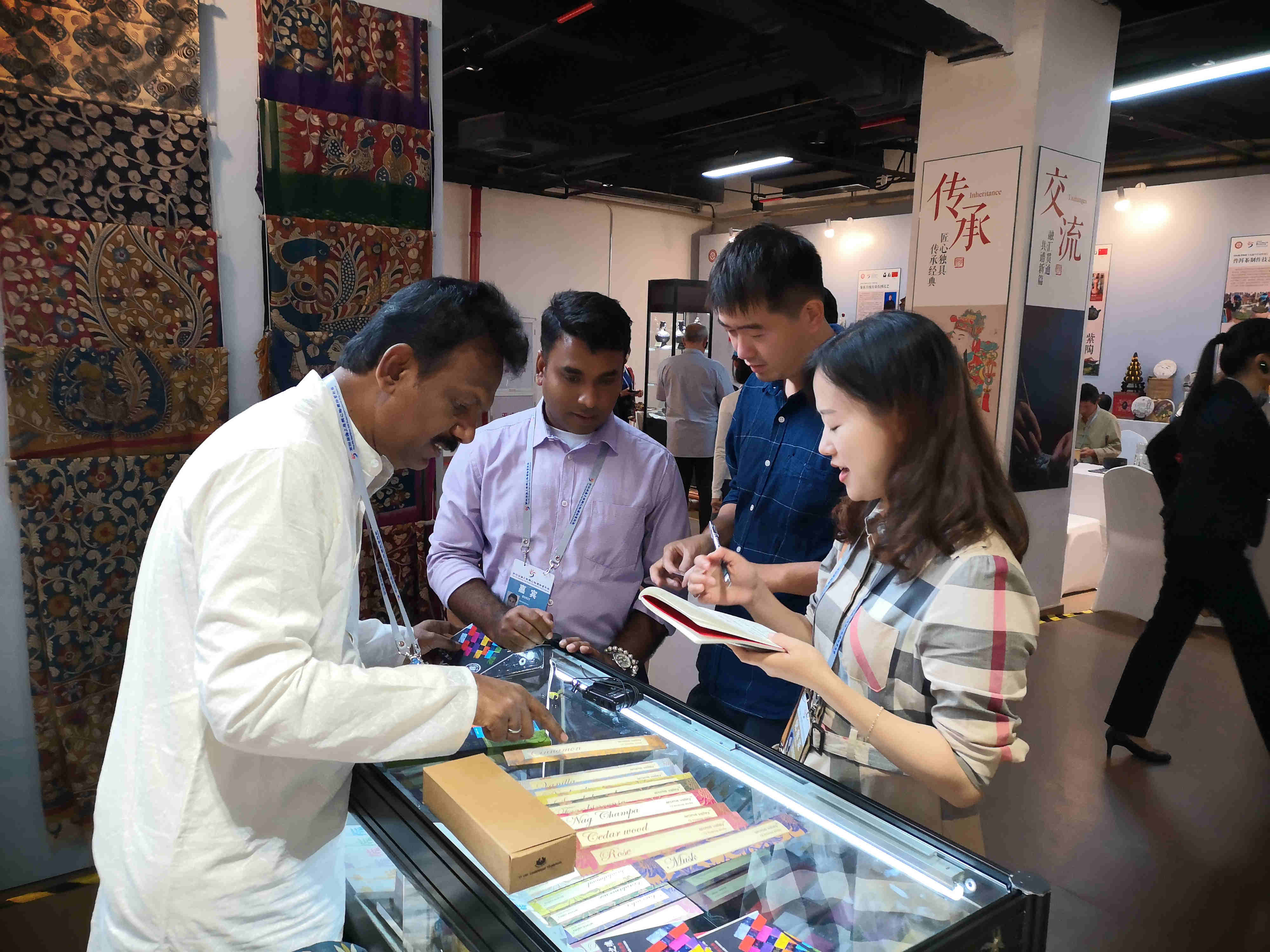 來自印度的非遺傳承人正在向觀眾詳細講解手工技藝