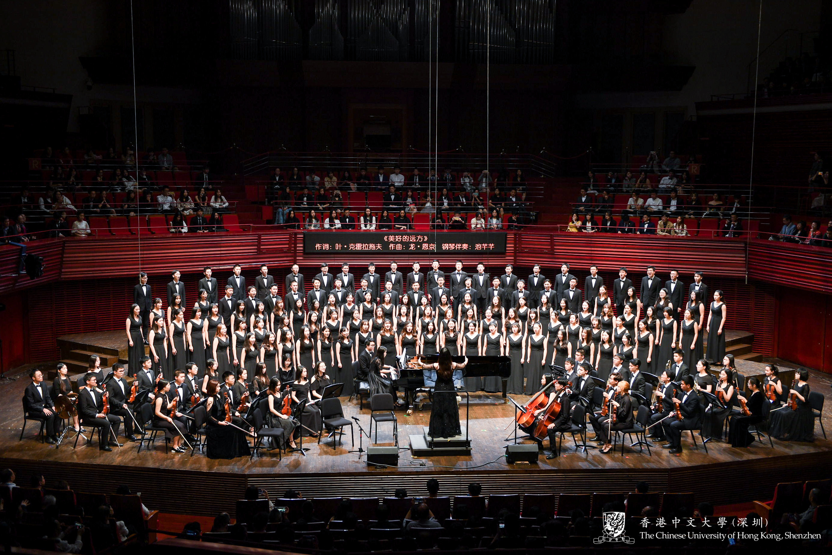 香港中文大學(深圳)2019音樂會不僅帶來了經典的中樂合奏、婉轉悠揚的雙小提琴鋼琴合奏、管弦樂合奏、國粹越劇,家長藝術團也獻上了美妙的舞蹈,特邀嘉賓華語流行歌手旦增尼瑪與中國音樂劇演員劉岩傾情獻唱,獲得觀眾的陣陣掌聲。音樂會時而濃烈激蕩,時而溫暖舒緩,觀眾沉浸在樂聲與歌聲的浪漫遐想中,最後,香港中文大學(深圳)合唱團合唱之聲響徹深圳音樂廳,帶着對大學深沉的愛,對祖國的真摯祝福,香港中文大學(深圳)2019音樂會圓滿落幕。
