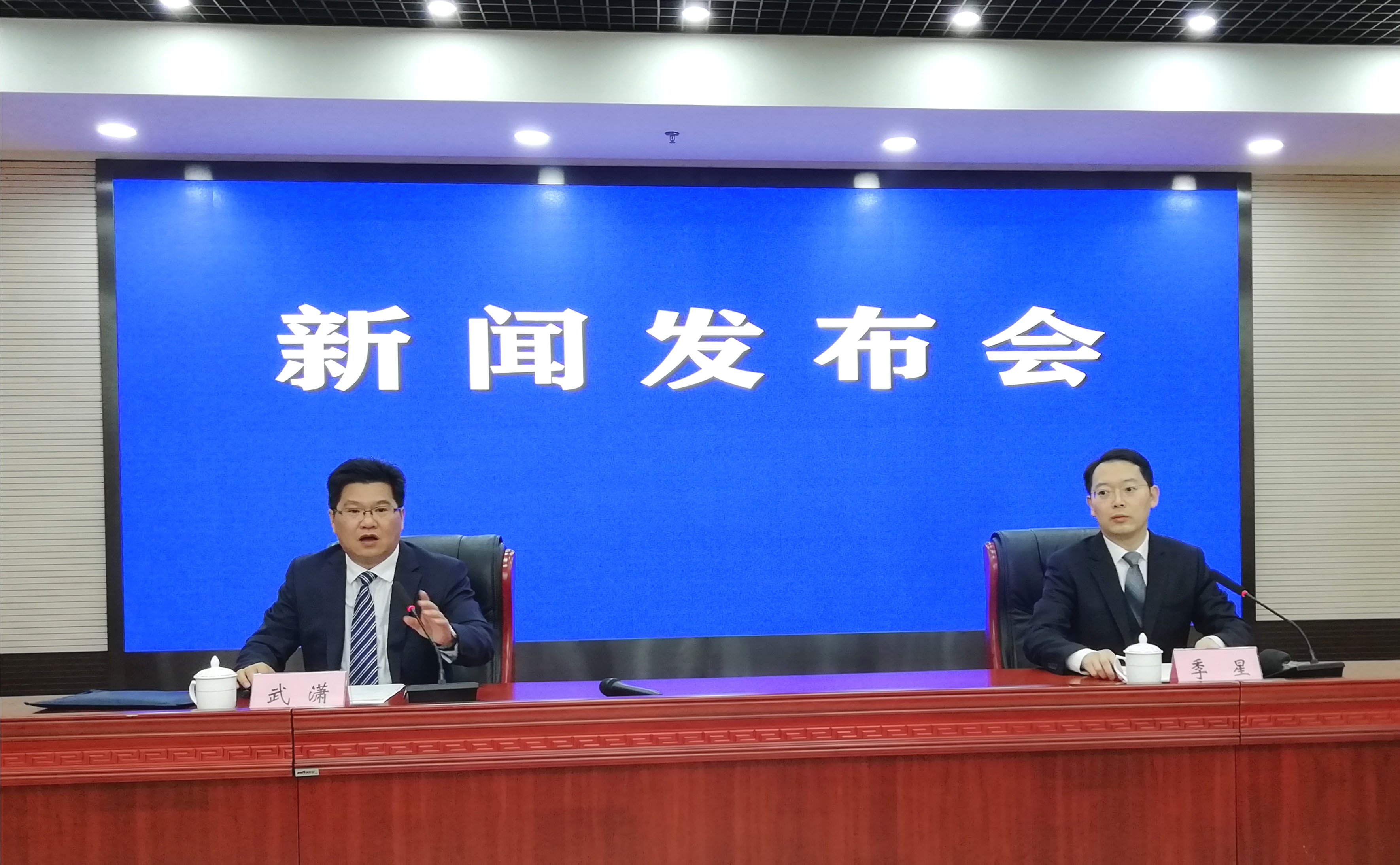 發佈會現場。左起,安徽省委宣傳部新聞發佈處處長武瀟主持發佈會,省人社廳黨組成員、副廳長季星介紹有關情況並回答記者問(孫軍/攝)