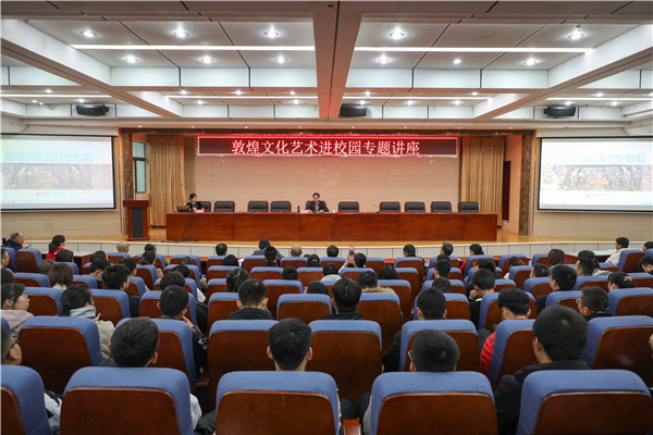 【香港商報網訊】27日下午,敦煌文化藝術進校園專題講座在蘭州工業學院舉行。敦煌研究院黨委委員、紀委書記廖士俊應邀作“燦爛的敦煌石窟藝術”的專題講座。期間,廖士俊圍繞“敦煌石窟概況”、“敦煌石窟藝術的主要內容”、“敦煌石窟藝術的珍貴价值”、“敦煌研究院保護、研究、弘揚工作”以及“莫高精神”五個方面內容,解讀了敦煌石窟藝術的歷史價值、藝術價值、科學價值和社會價值。