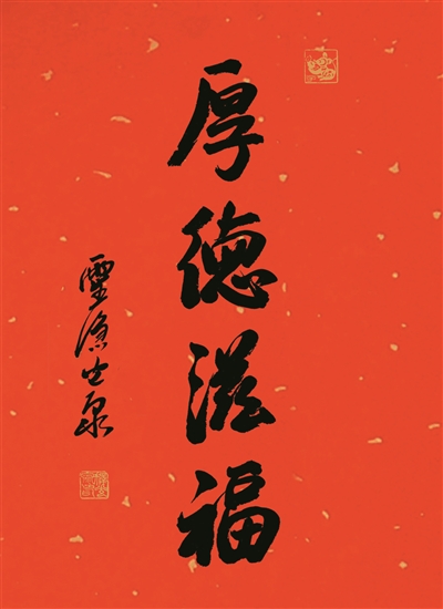 對即將到來的2020年,光泉法師寫下的祝福是:厚德滋福。目前,2020庚子新年「厚德滋福」祝福年曆已經開始印製,喜慶的大紅年曆很快就要與大家見面了。光泉法師對題寫「厚德滋福」作瞭解釋,「厚德」是指要用像大地一樣寬厚的德行來容載萬眾、萬象、萬事、萬物。厚德是中華文化的精神之魂。「厚德」主要有兩層含義:一是指日常道德修養,二是指高遠博大胸懷。而「滋」是「滋養」「增長」的意思。長養厚德,才能給我們帶來幸福。在2020年祝福年曆的右上角,蓋有一方專為庚子鼠年而刻的生肖章,別具中國傳統文化的韻味。