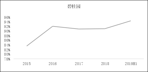 公司始終堅持兩條紅線,第一,在手資金佔比超過總資產的10%;第二,負債率控制在70%以內。2019年中期,碧桂園在手資金佔比為12%,足以覆蓋短期有息負債;凈負債率為58.7%,在規模快速增長的過程中,碧桂園依然能保持較低的財務槓桿,並將凈負債率控制在行業低位。