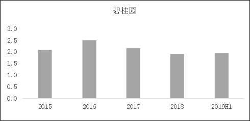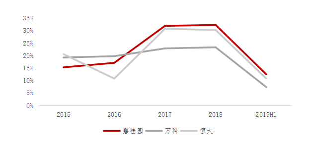 自2017年碧桂園摘取行業第一的銷售桂冠後,企業連年保持銷售規模增長,成為名副其實的行業龍頭,這一階段主要受益三四線紅利影響,並且在三四線城市中優渥的土地為公司提供了充分的盈利空間。當前,碧桂園依然能保持較高的利潤率水平,除了早先儲備價格低廉的土地外,更依賴於公司的精準拿地。這個時期,碧桂園從規模之王逐漸向利潤之王轉變。根據碧萬恆歷年歸母凈利潤變動,2019年中期碧桂園實現歸母凈利潤156.4億元,超過萬科和恆大。從企業ROE水平來看,碧桂園從2017年起便保持着優勢,2019年中期ROE達到12.4%。