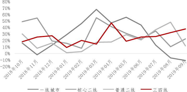 2018年初,一二線核心城市在政策的強調控下,成交量率先開始萎縮,一線城市和一些核心二線城市均出現不同的下降。2019年初,尤其是在2月份之後,這些城市的成交量開始回暖,我們認為這一階段一二線核心城市成交的回暖只是反彈,而不會形成長期的趨勢,成交難以反轉。然後在5、6月份之後,這類城市成交量同比逐步下滑,尤其是一線城市在8、9月份的成交量下滑嚴重。