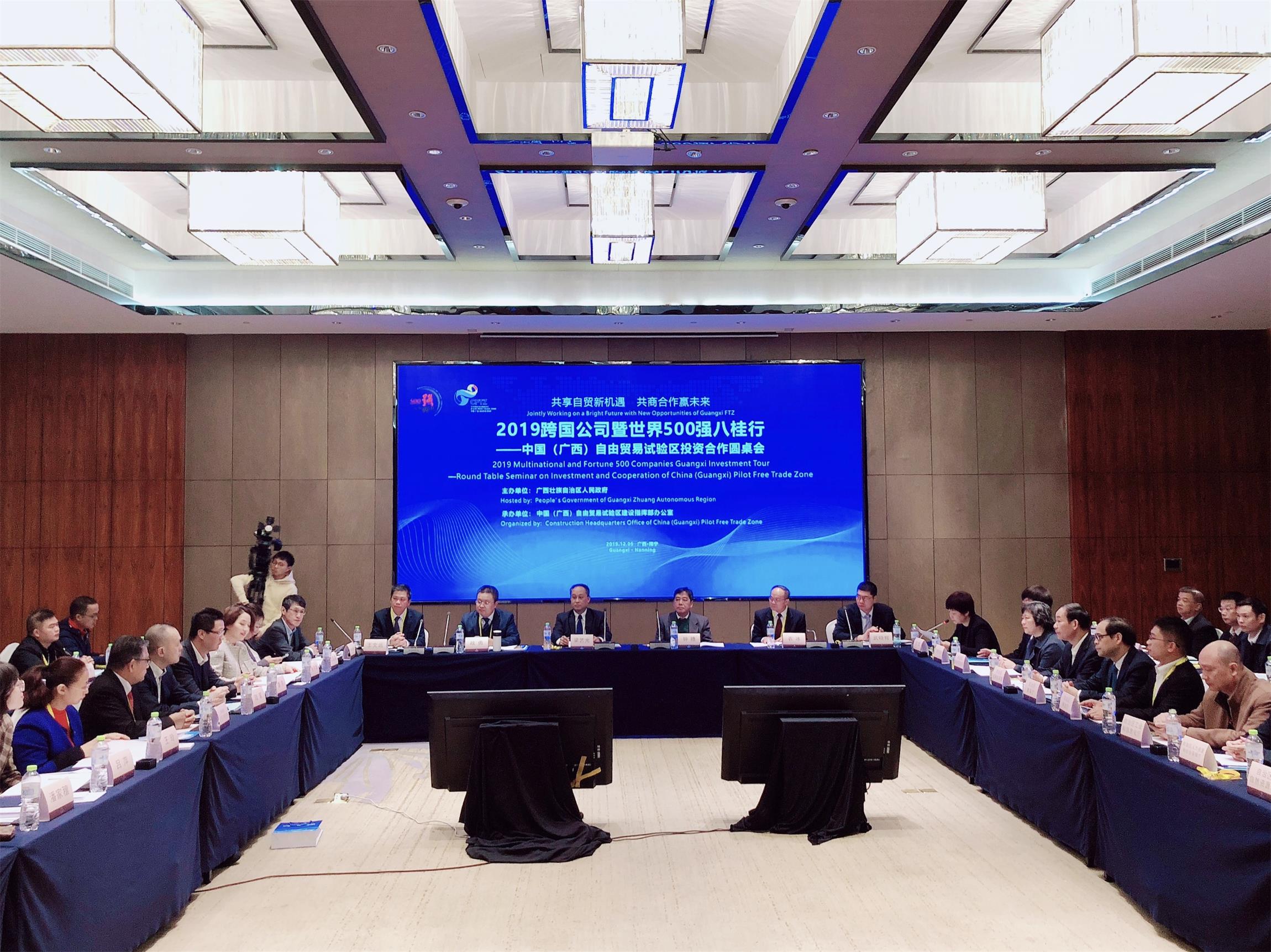 【香港商報網訊】12月5日,2019跨國公司暨世界500強八桂行—中國(廣西)自由貿易試驗區投資合作圓桌會在廣西南寧舉行,來自美國沃爾瑪、日本丸紅株式會社、日本瑞穗銀行等跨國公司、世界500企業,中國華能集團、浪潮集團、中國香港(地區)商會、東盟—馬中經貿文化促進會等境內外知名企業和商協會機構代表共100多人參加。