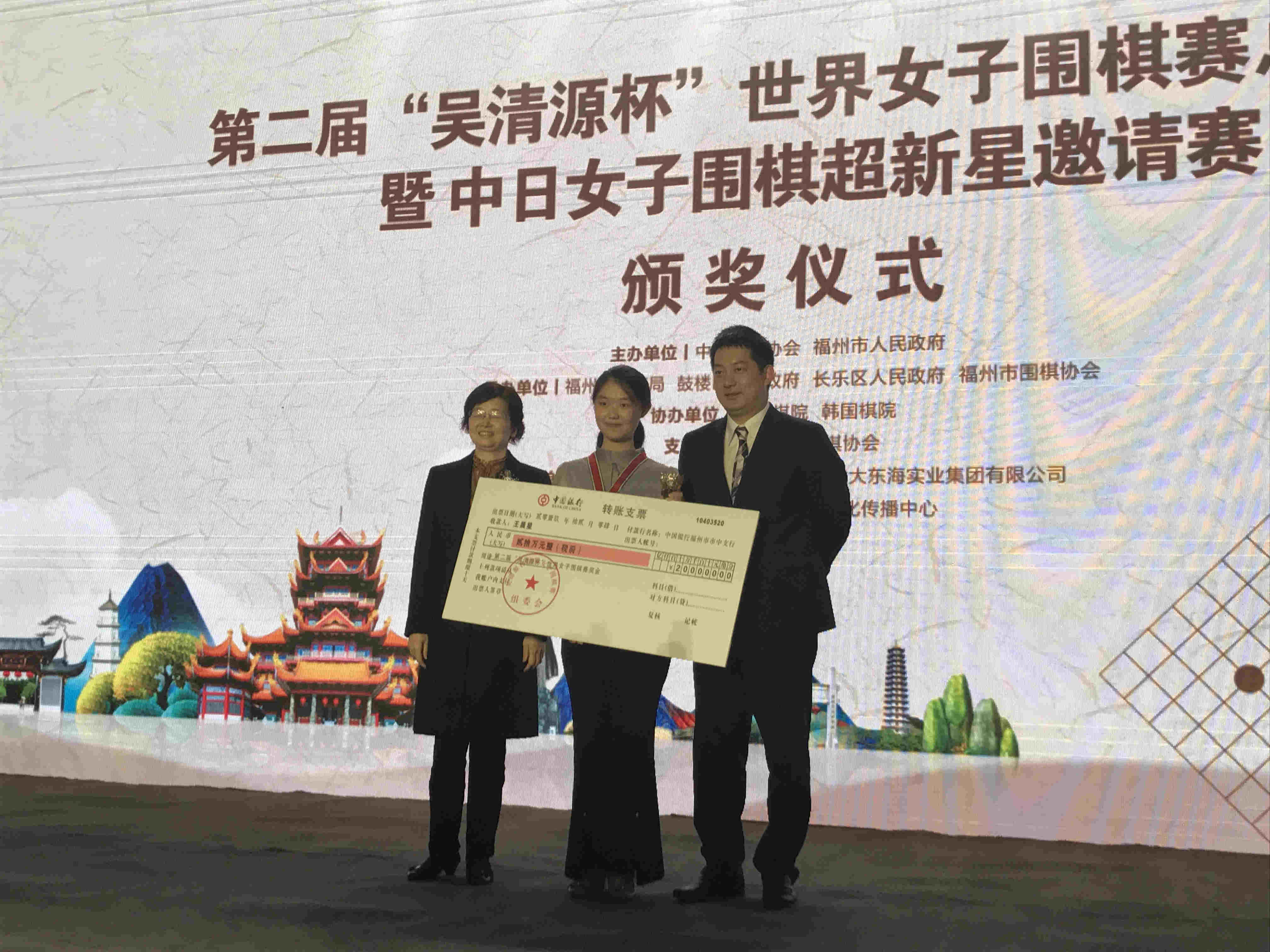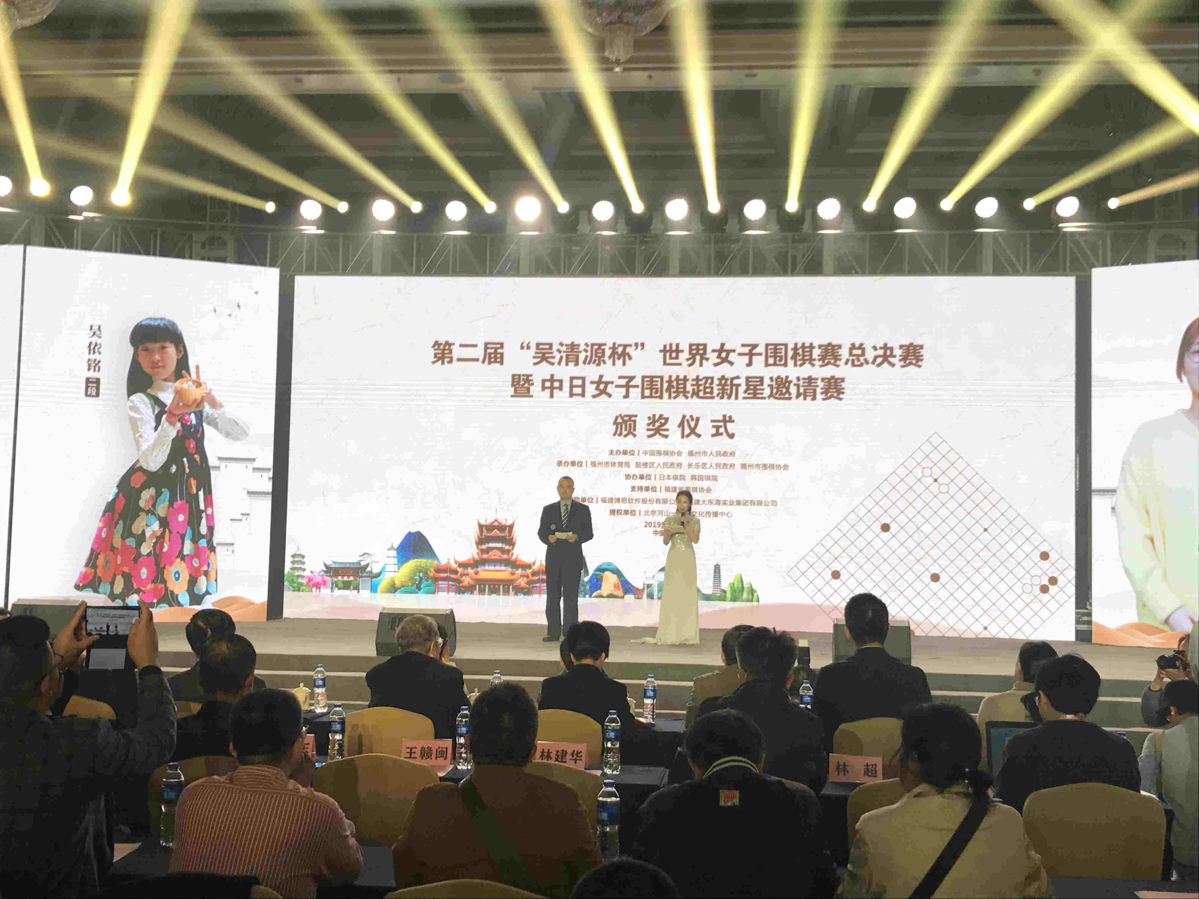 福建省圍棋協會名譽主席戴濱輝、福州市體育局黨組書記劉丹為中日女子圍棋超新星邀請賽優勝獎獲得者吳依銘和友誼獎獲得者仲邑堇頒獎。吳依銘和仲邑堇是目前中國和日本最年輕的職業女棋手。