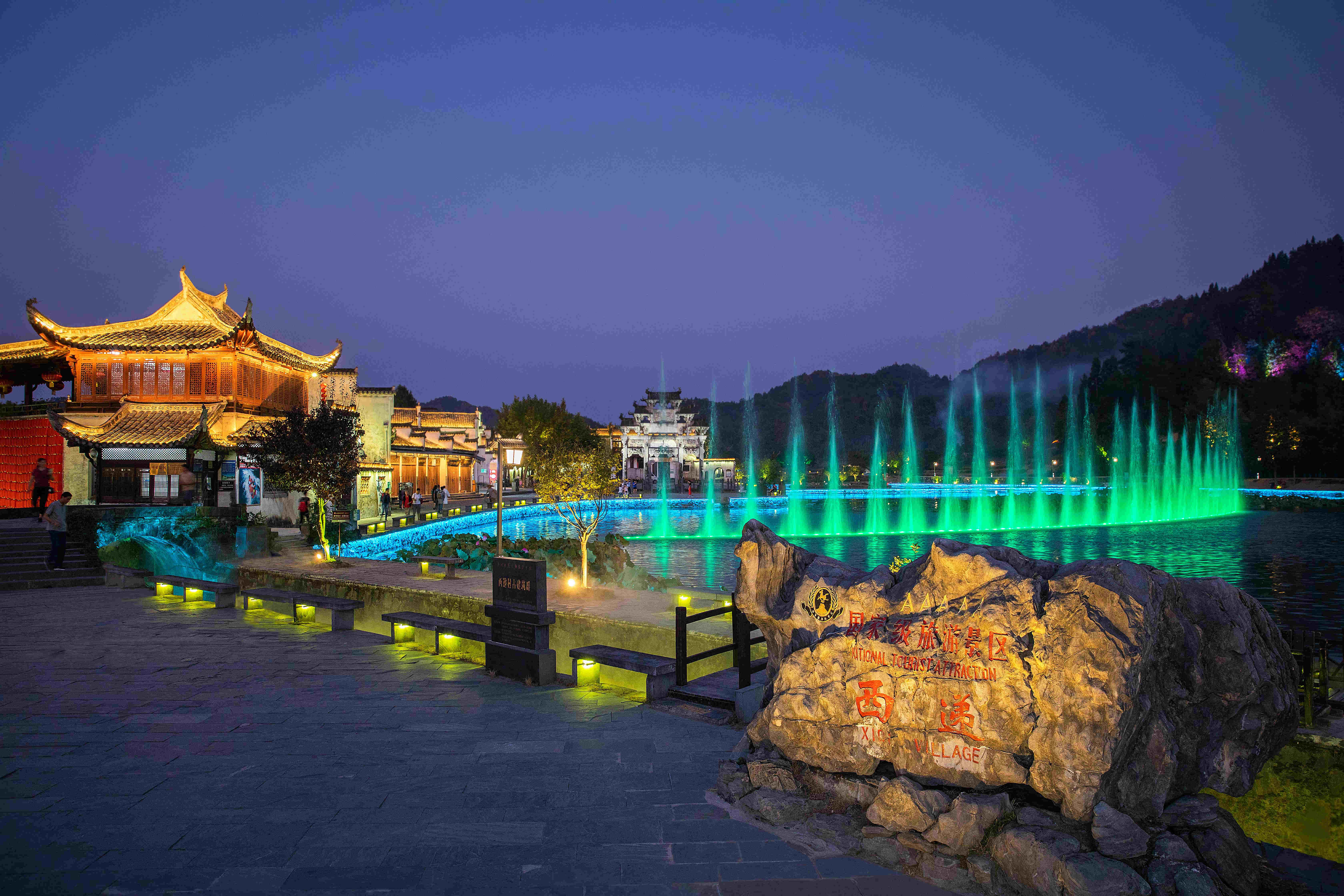 白牆青瓦的徽式古民居、矗立在村口四百餘年的胡文光刺史牌坊在3D投影技術的裝扮下“動”了起來,五星紅旗也通過水幕電影的形式飄揚在夜空。遊客紛至遝來會聚西遞,移步換景,流連忘返。