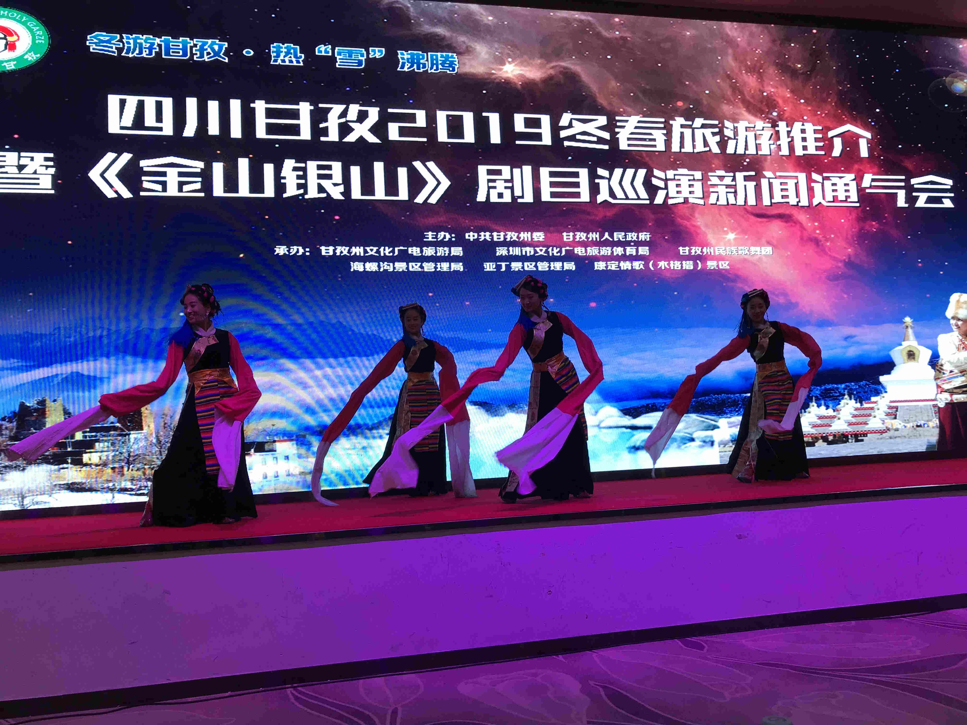 【香港商報網訊】記者 蘇偉 報導:“跑馬溜溜的山上,一朵溜溜的雲喲。端端溜溜的照在,康定溜溜的城喲。”12月6日,深圳南山國際會議中心(集悅城)歌聲嘹亮,舞蹈歡樂。由四川甘孜州委、州人民政府主辦,州文化廣電旅遊局、深圳市文化廣電旅遊體育局、甘孜州民族歌舞團承辦的四川甘孜2019冬春旅遊推介暨《金山銀山》劇碼巡演(深圳站)新聞通氣會在深圳舉行。