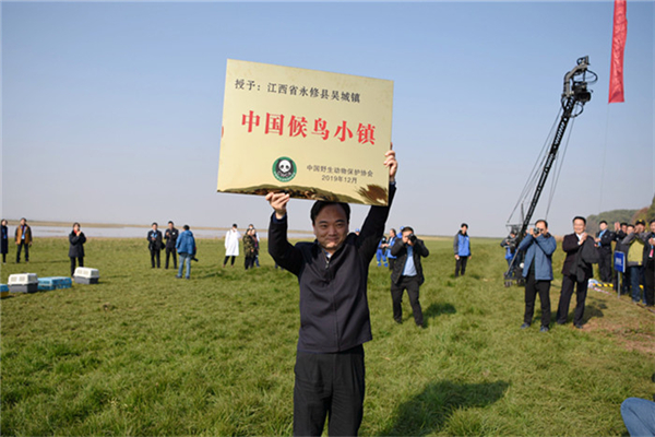 余小發、許斌、天津市野生動物救護繁育中心代表先後致辭;李青文宣讀了《中國野生動物保護協會關於授予永修縣吳城鎮「中國候鳥小鎮」的決定》,張習文為吳城鎮授予「中國候鳥小鎮」牌匾,吳城鎮正式成為全國首個國際候鳥小鎮。