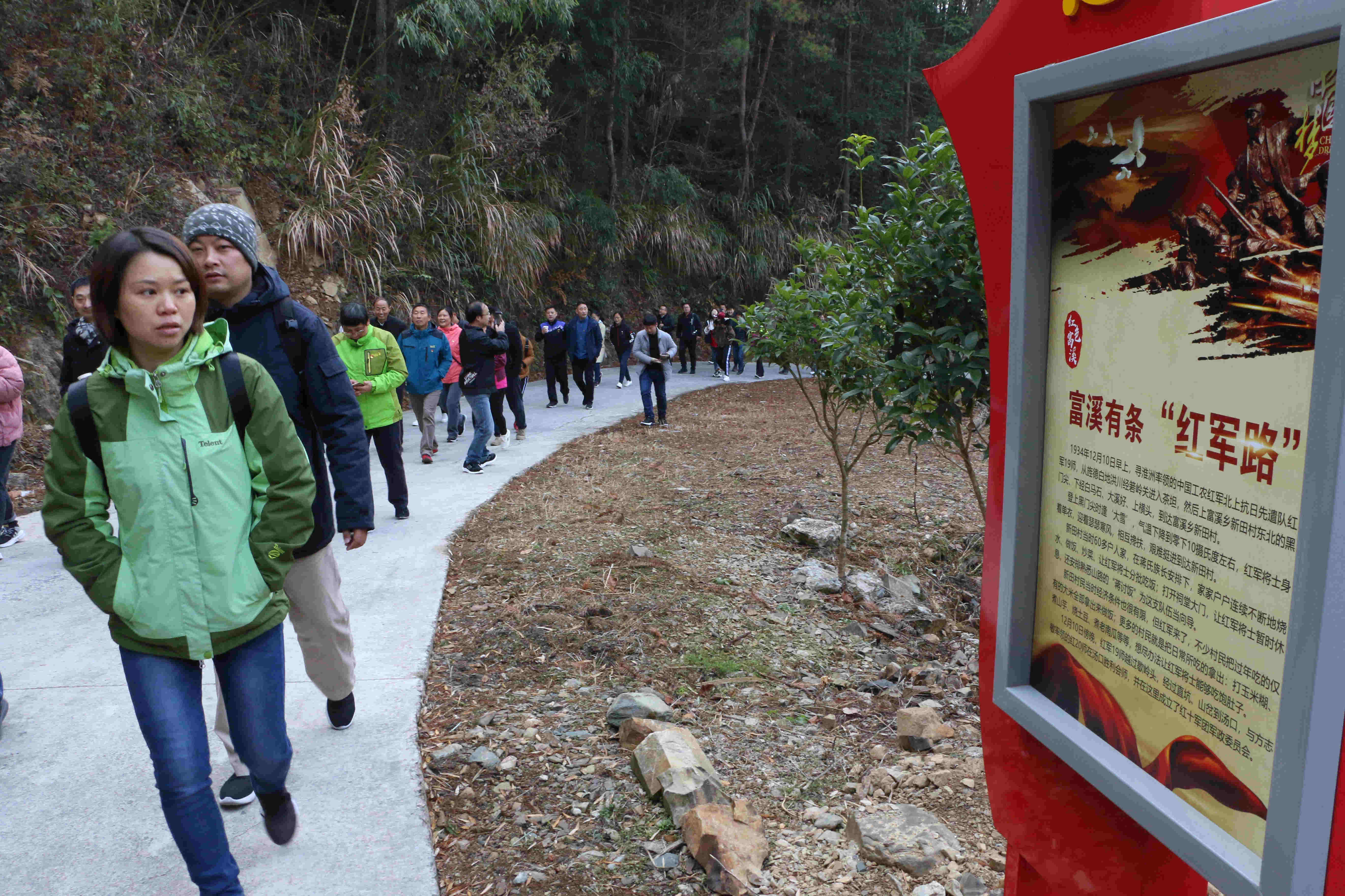 全體活動人員於富溪鄉碣石村百福廣場參加開幕式後,從百福廣場步行至小塢紅色富溪記憶館參觀,沿途經小塢、大塢嶺紅軍堡壘戶革命遺址,最後到達百福廣場吃憶苦飯,補充能量。全程約6.8公里,重走當年紅軍遊擊的路線,一路軍歌嘹亮,穿過楓楊林、茶花林、野豬林、竹林、茶園,欣賞沿途的高山風景,撲鼻的淡淡毛峰茶香,行至山頂處可遠眺黃山天都峰,峰巒疊起、雄偉壯麗。