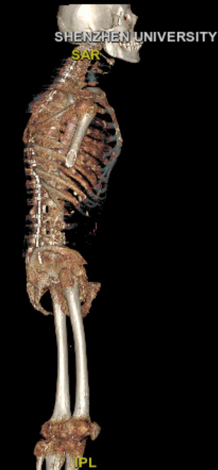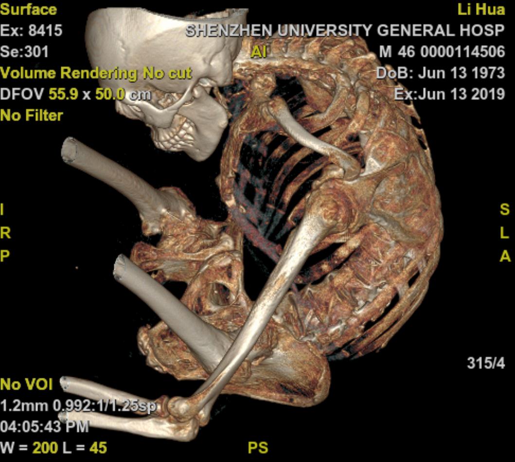 頭蜷縮在大腿上,從脖子到腰部再到骨盆,包括髖部在內的關節完全融合了,像根棍子一樣沒有彎曲度和活動度。在李華全脊柱正側位的X光、CT平掃及三維重建下,他呈現出一種難以形容的捲曲姿態。