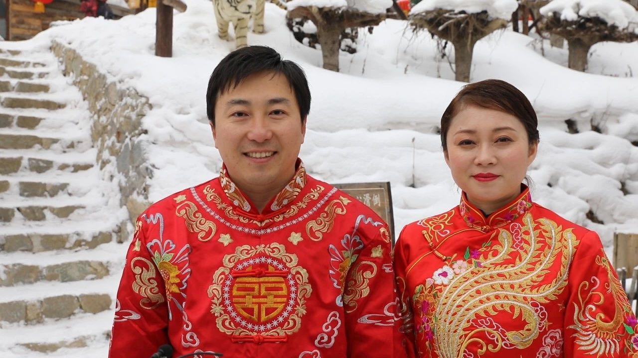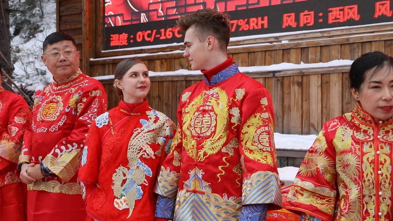 這10對「新人」,既有新婚的小夫妻,也有慶祝金婚的7旬夫婦。集體婚禮的「新人」本來是寓意長長久久的九對,但在活動前一天,一對深受雪鄉景色吸引的俄羅斯情侶,臨時決定加入這場集體婚禮,這就有了寓意「十全十美」的十對新人。