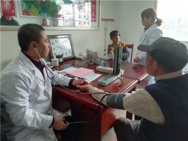 在望江縣楊灣鎮豐樂村衛生室,鄉村醫生疏義貴為村民量血壓(孫軍/攝)