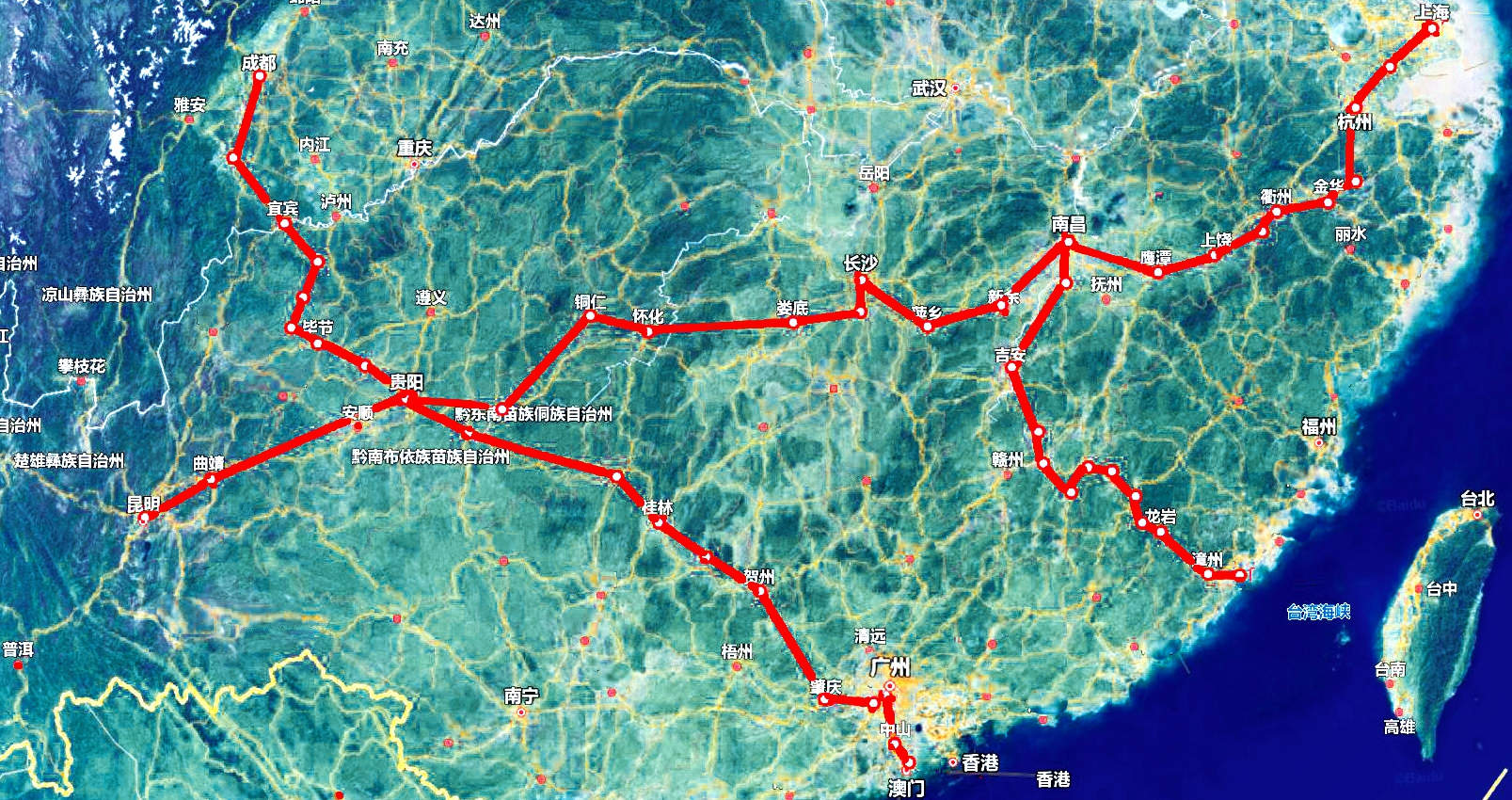 標紅路線為未來宜賓經成貴高鐵可直達的部分城市