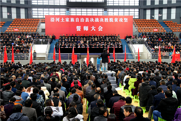 當天會上,「我宣誓:脫貧攻堅,我是戰士;服從命令,奮勇衝鋒;不打勝仗,誓不罷休;不打勝仗,誓不罷休!」沿河自治縣3000餘名黨政幹部在黃金山體育館齊聲宣誓,聲音鏗鏘有力,響徹雲霄,向深度貧困宣戰。(黃慶松 任廷海 )