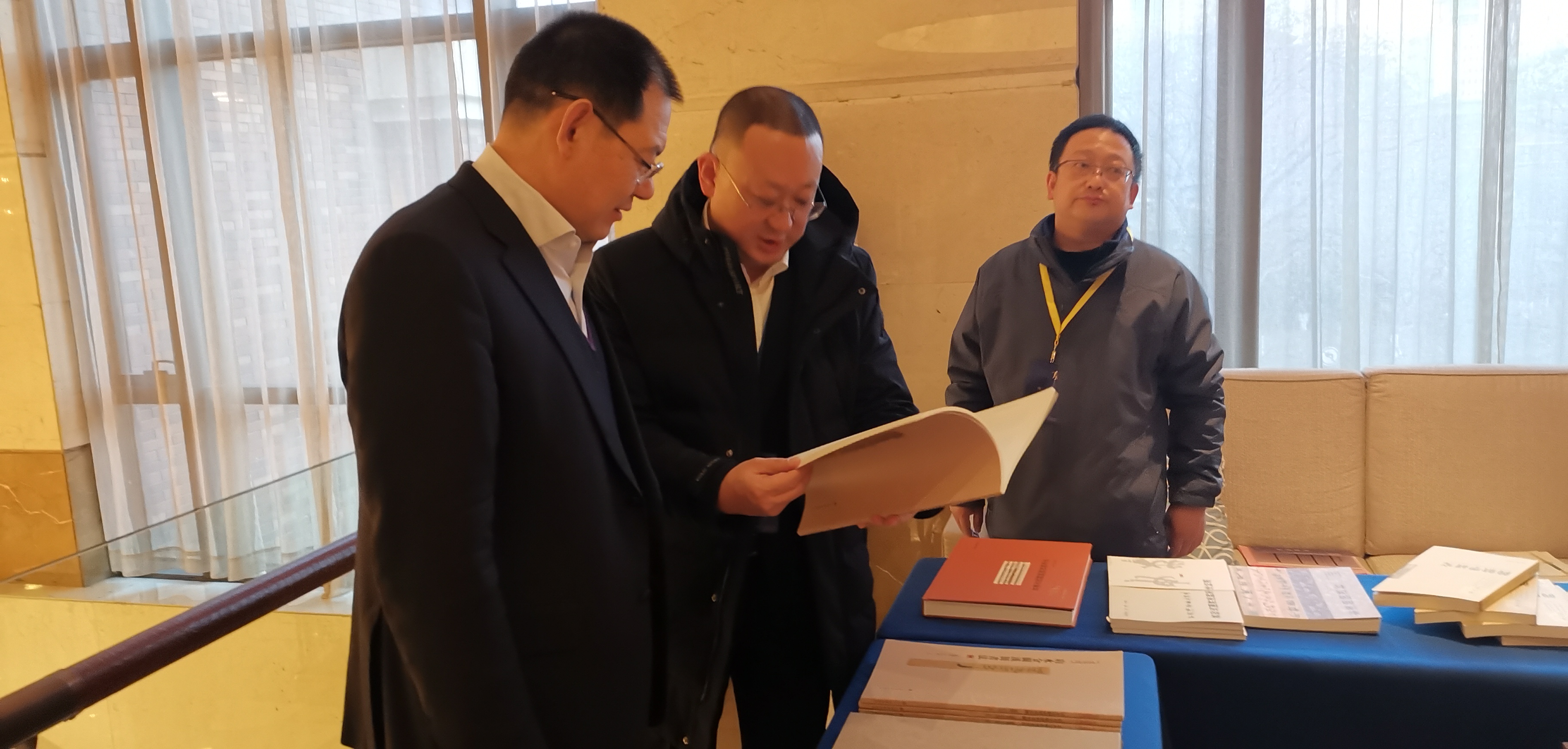 甘肅簡牘博物館館長朱建軍向蘭州市委常委、宣傳部部長王宏(左一)介紹出版的甘肅簡牘著作