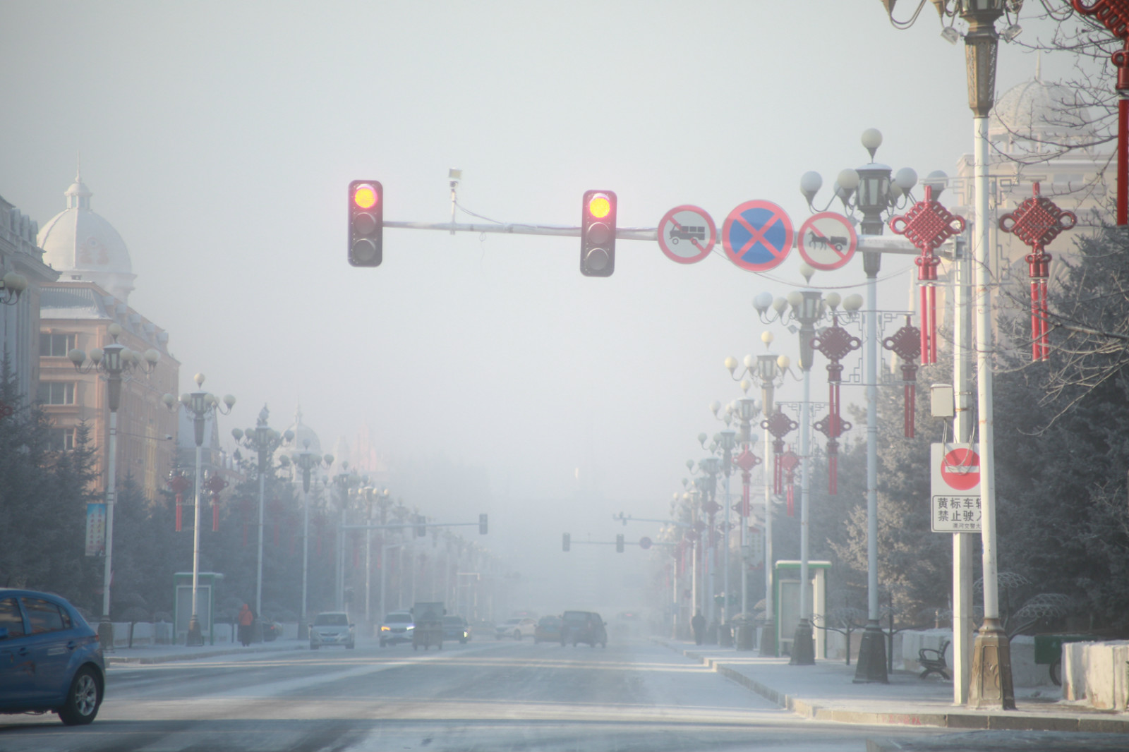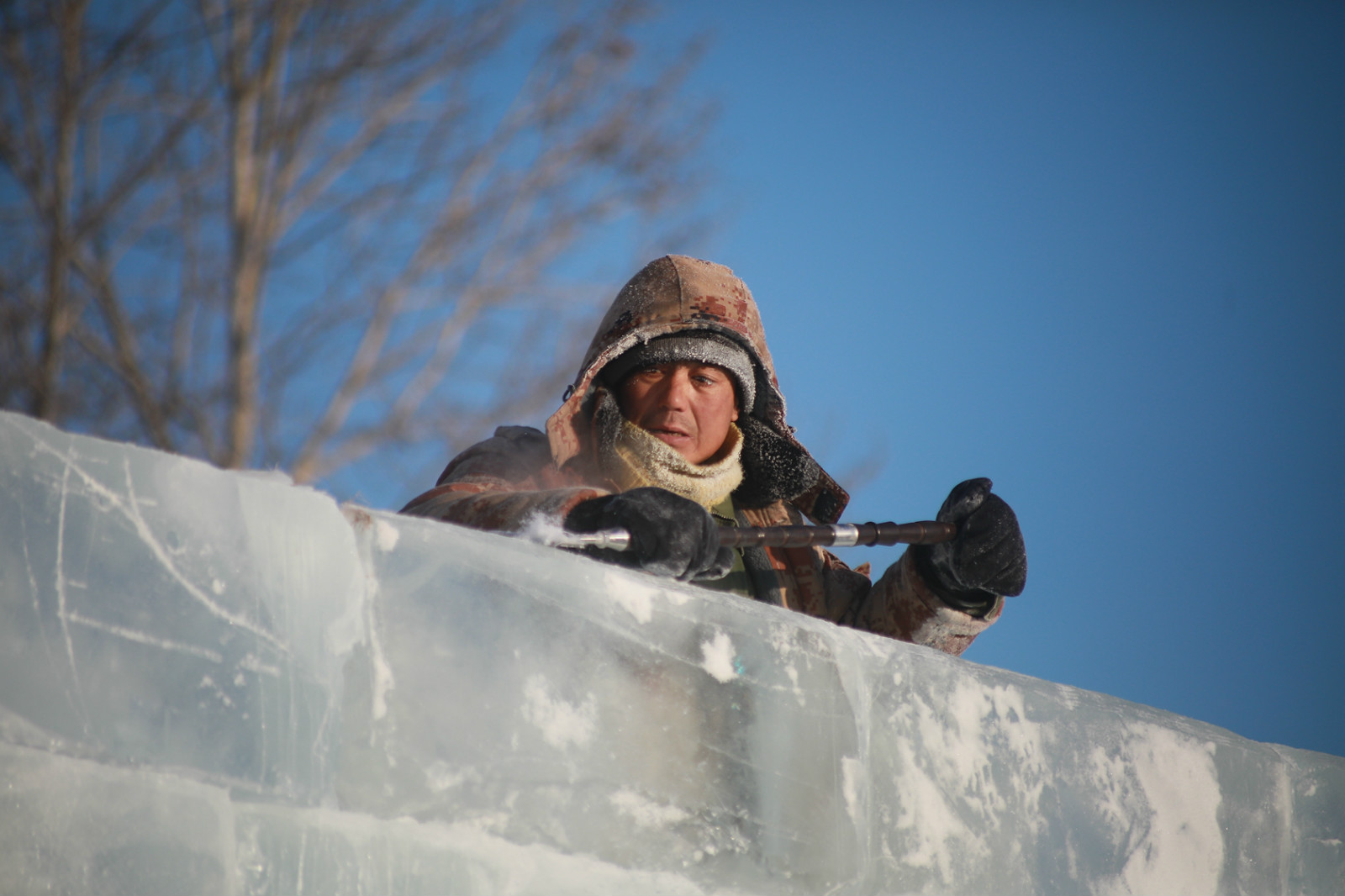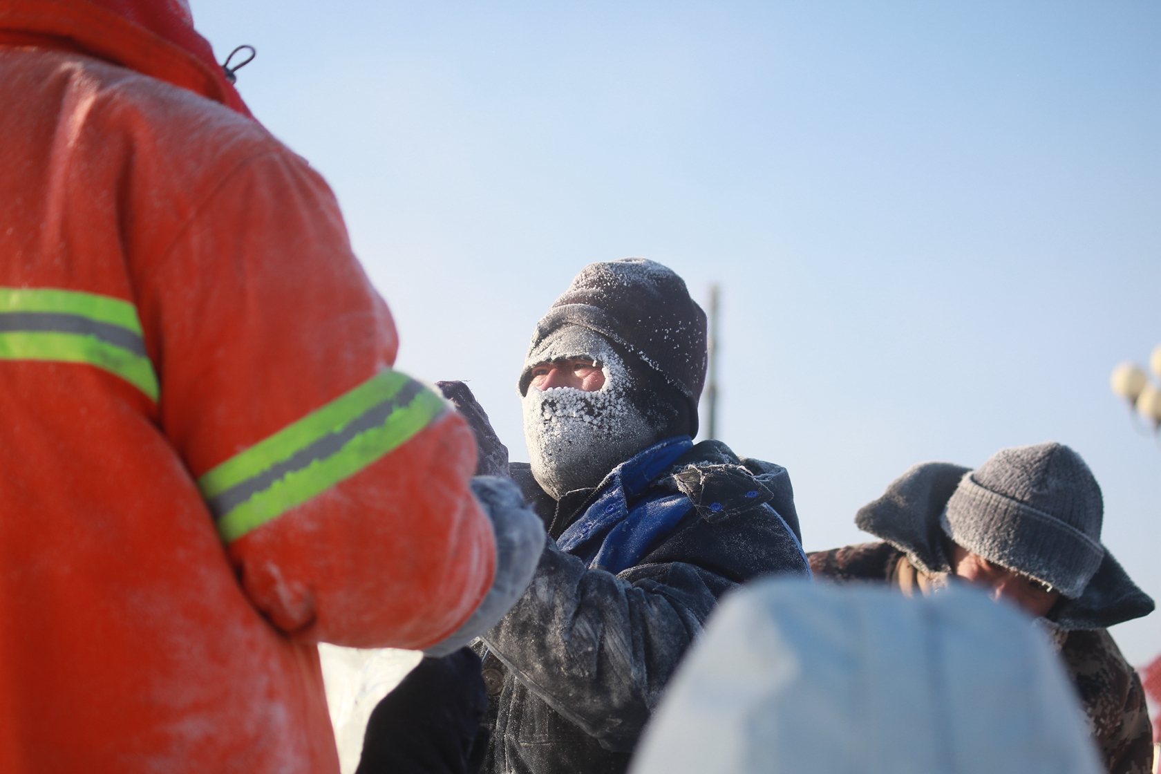 寒冷的天氣使空氣中的水汽凝華而出現極端冰霧天氣,也就是當老百姓常說的「冒白煙」。清晨的街道籠罩在一層白霧之中,能見度不足200米,過往車輛紛紛開啟霧燈、減速慢行,行人和在外作業的工人紛紛換上最厚的冬裝,抵禦冰霧帶來的寒冷。冰雕師傅李在波說,這兩天氣溫下降的幅度大,上午氣溫都在零下四十度左右,感覺特別冷,早晨出來把最厚得衣服和鞋都穿上了,鞋裏面穿了三層毛襪子,要不真受不了這麼冷的天氣。