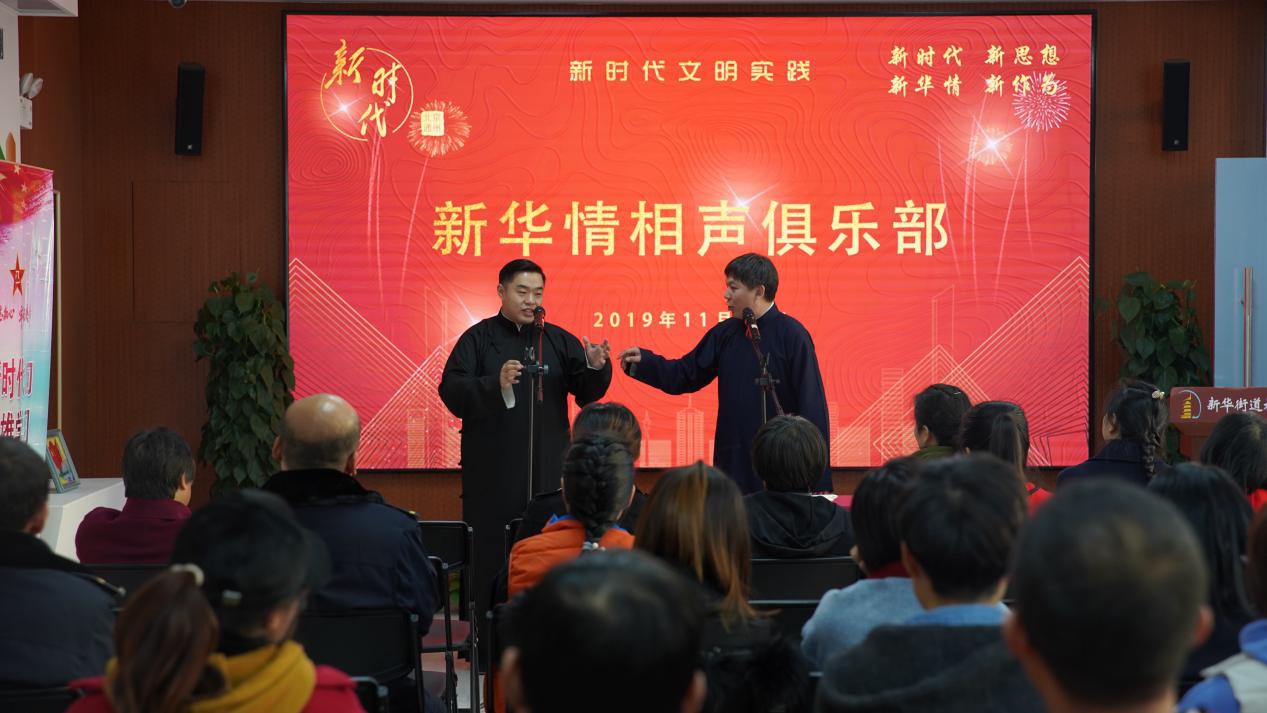10月10日,新華街道新時代文明實踐活動“新華情相聲俱樂部”首場演出活動在街道黨群活動中心拉開帷幕。魏鵬、孫鈺童等青年相聲演員為轄區居民送上了一道道開心大餐。俱樂部每週四為社區居民送去歡樂,並與喜愛相聲表演的居民交流學習創作心得。