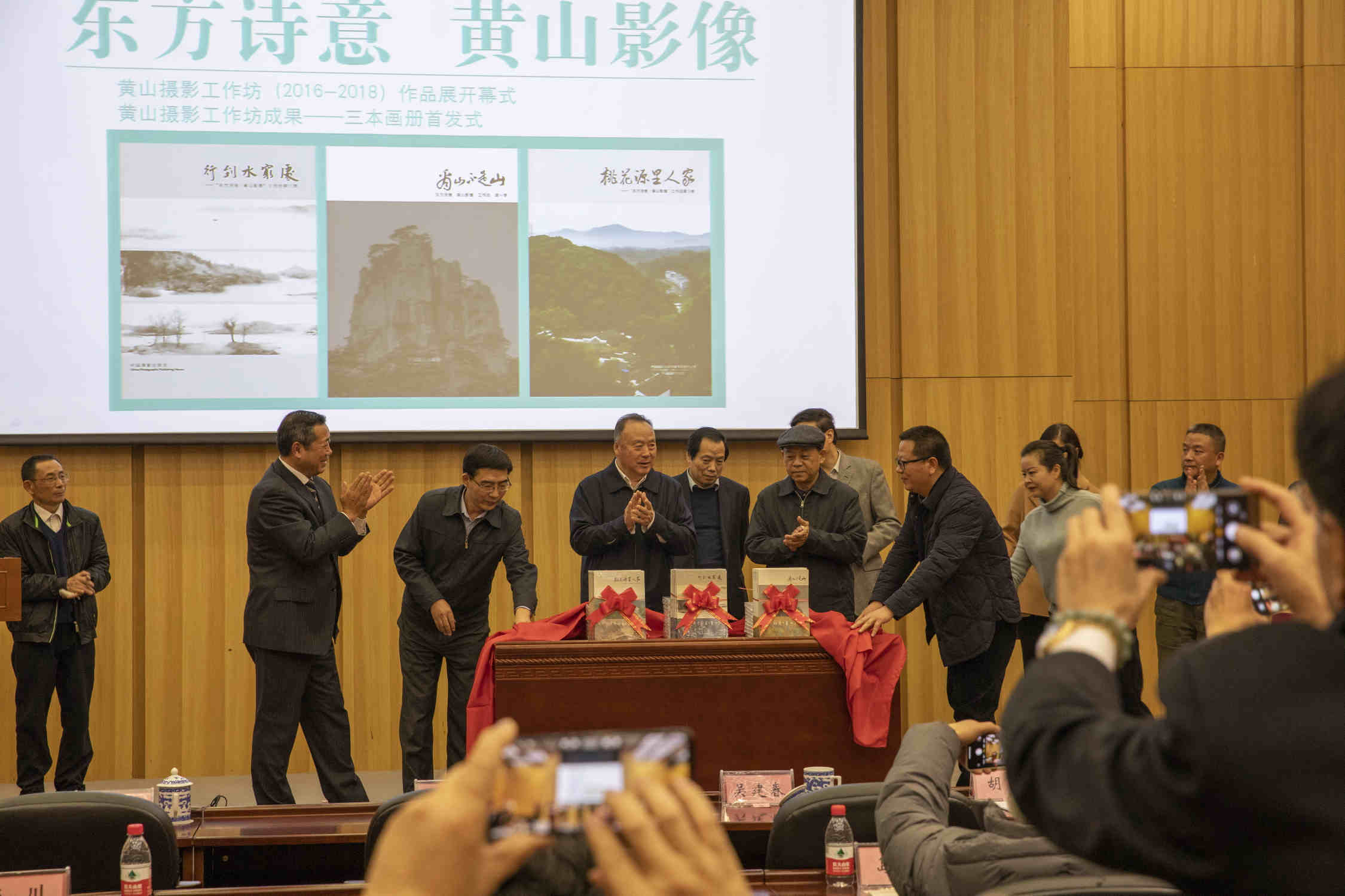 白立忱、夏潮、吳建春、胡寧、高揚共同為此次展覽和黃山攝影三期工作坊成果,《看山不是山》《行到水窮處》《桃花源裏人家》三本畫冊的首發式揭幕。中共黃山市委宣傳部副部長吳紹輝主持開幕式。