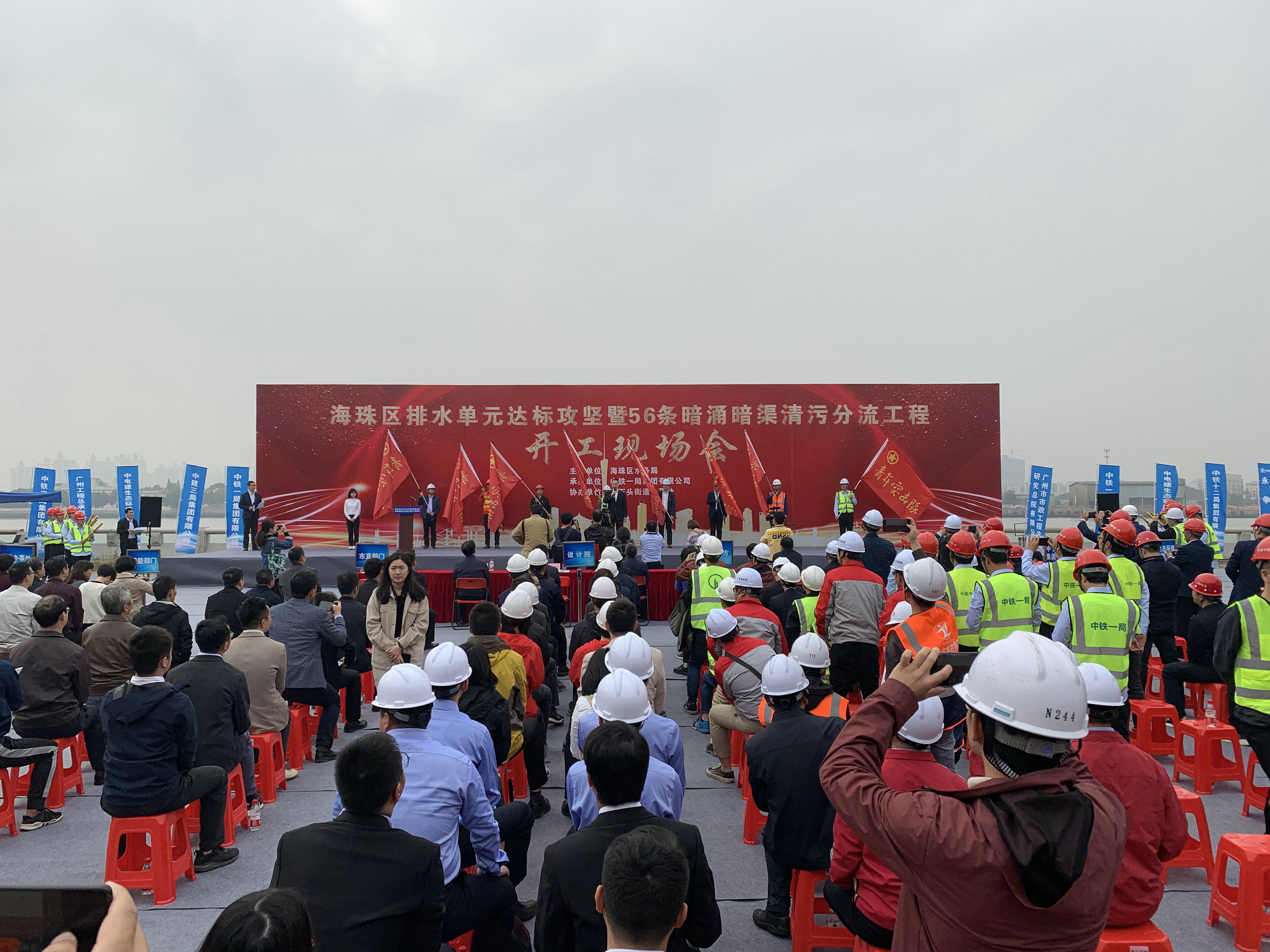 在當天的現場會上,廣州市水務局、廣州市水務投資集團有限公司相關負責人為參建單位「青年突擊隊」授旗,海珠區相關負責同志宣布開工,吹響了海珠區排水單元達標攻堅暨56條暗涌暗渠清污分流工程開工的號角。
