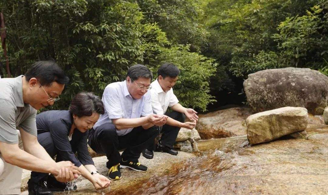 湖南省委書記杜家毫(右二)在藍山縣湖南湘江源國家森林公園實地考察湘江源頭生態環境保護情況時,捧起清冽甘甜的源頭活水,一連喝下三大口,並叮囑當地保護湘江首先要保護好源頭
