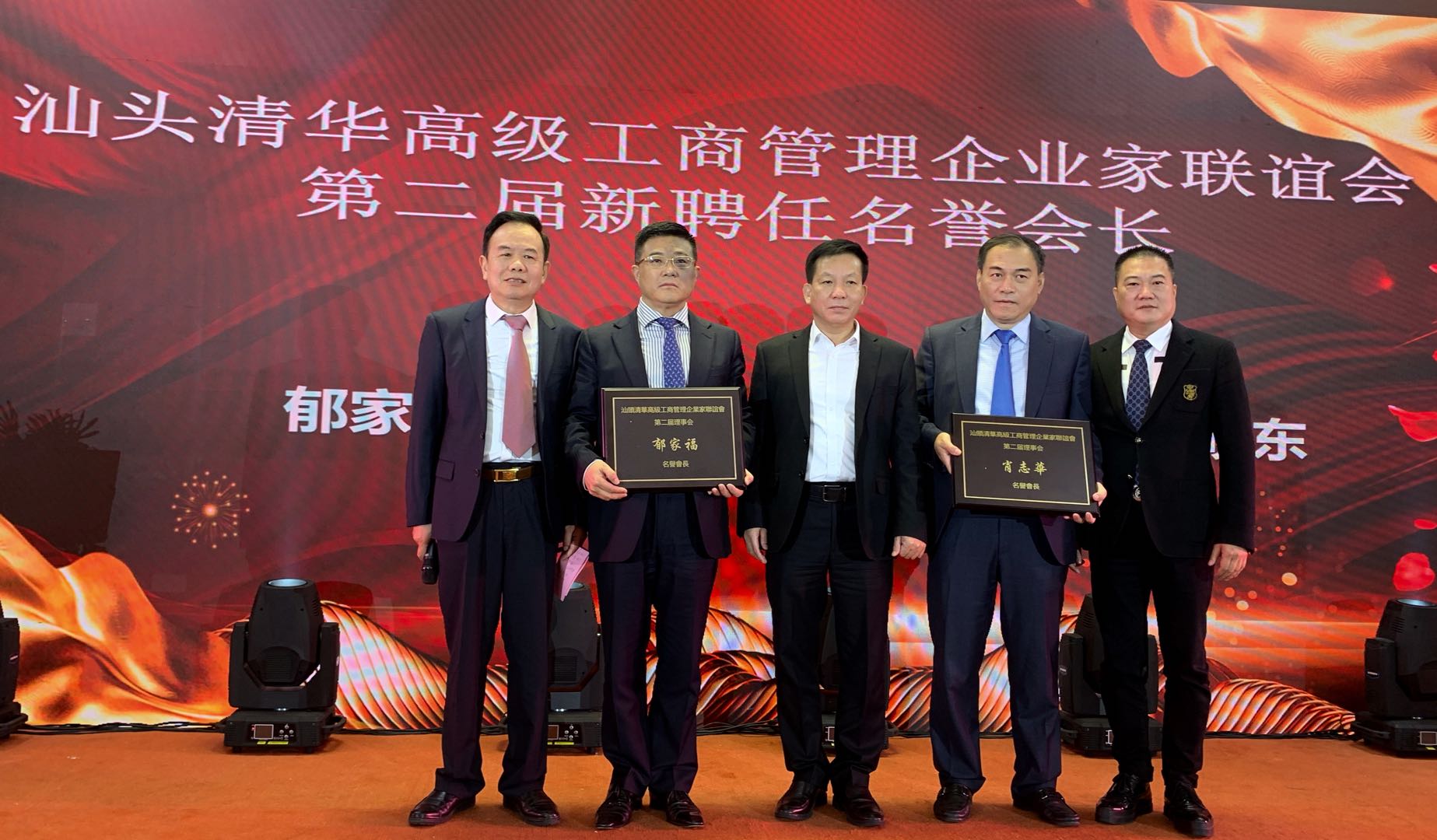 汕頭市民政局局長陳鎮坤(左3)、汕頭清華高級工商管理企業家聯誼會會長郭祥彬(右1)及執行會長吳騰生(左1)為名譽會長頒發牌匾