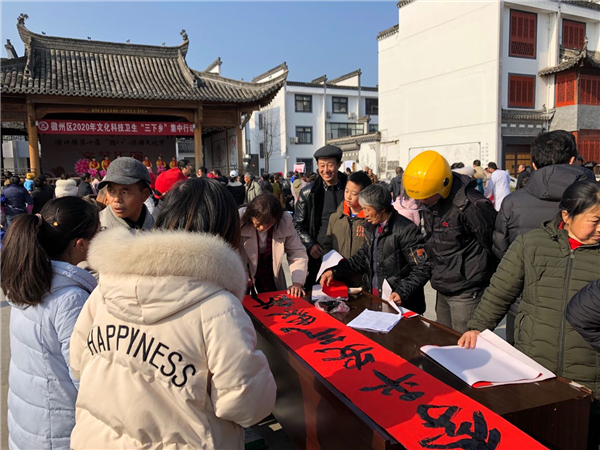 當天,徽州區2020年文化科技衛生“三下鄉”集中行動啟動儀式在潛口鎮坤沙村舉行。農業、科技、司法、衛健、人社、文旅體等10餘家部門單位的工作人員熱情為當地村民答疑解惑,書寫春聯、開展義診,以多樣化的宣傳形式普及農業科技、醫療保健、法律法規等方面的知識。