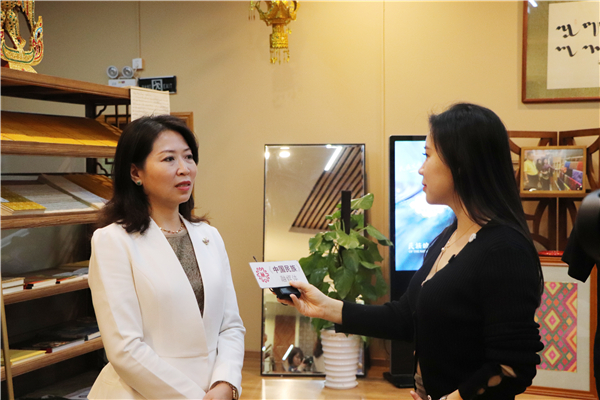 在“晚象民族非遺館”,公司創始人孔麗向袁泉處長及媒體代表等一行介紹了民族非遺館主要收藏和展示的各族傳統非遺手工藝品、民族服飾、生產工具、樂器、文獻、民族圖騰等,重點介紹公司近年來致力於搶救的傣族非遺織錦項目以及公司在傣族歷史文化研究及非遺專案挖掘上的工作,其中具有3000年歷史記憶的國家級非物質文化遺產傣族織錦是公司文創研發的核心,通過自主創新研發的晚象文創是具有中國民族特色,融合中華傳統文化及傣族非遺特點的系列衍生品;董事長孔麗現場接受國家民委《中國民族雜誌》記者的採訪。