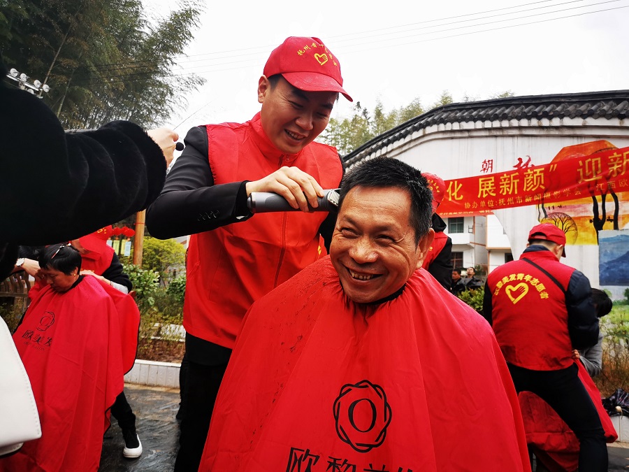 志願者們為村民免費理髮(李勇 攝)