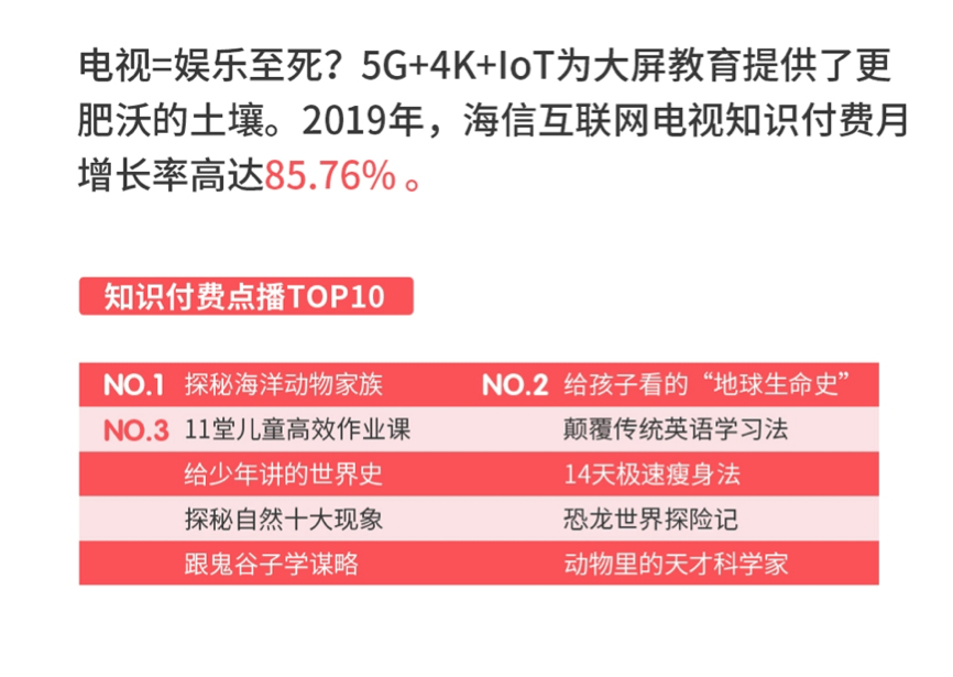 此外,2019年,海信互聯網電視知識付費月增長率高達85.76%。習慣了移動互聯網培養的知識付費生態,回歸客廳的年輕人會發現,5G+4K+IoT為大屏教育供了更肥沃的土壤。5G讓電視擁有了更多移動端不具備的場景優勢,知識付費在經歷了移動端的逐年疲軟後,或將在大屏端迎來新突破。