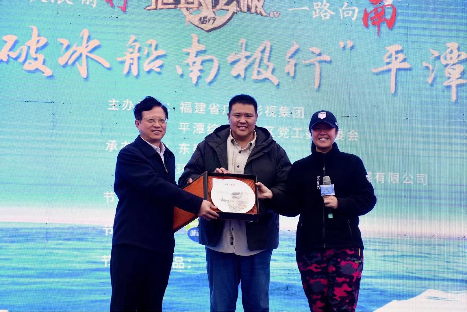 平潭綜合實驗區党工委委員、管委會副主任賴繼秋向張昕宇、梁紅贈送紀念品