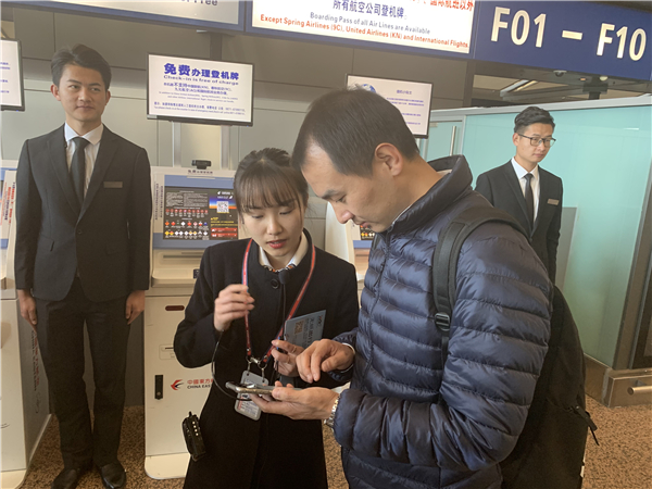 工作人員教前往長沙的旅客使用「無紙化」便捷乘機