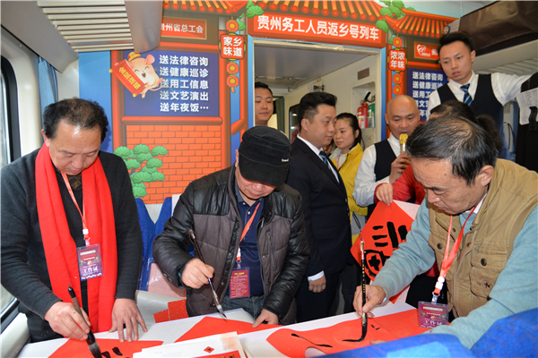 當天,貴州省總工會聯合成都局集團公司貴陽客運段,整合鐵路旅客列車運輸資源,從外出務工人員返鄉實際需求入手,以打造「貴州務工人員返鄉號」列車為載體,持續第四年在貴州列車上開展「接您回家—五送進車廂」暨「貴州務工人員返鄉號」活動,為外出務工人員開展「五送」專項服務。
