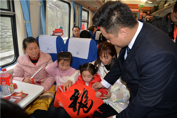 在K111次列車12號車廂,相聲、曲藝、舞蹈、魔術等精彩的文藝節目吸引返鄉農民工的目光,不時傳來陣陣笑聲、掌聲……在車廂的另一頭,省職工書法家協會的志願者揮毫潑墨,為車廂里的農民工兄弟送春聯、送祝福,僅送「福」就達千份。