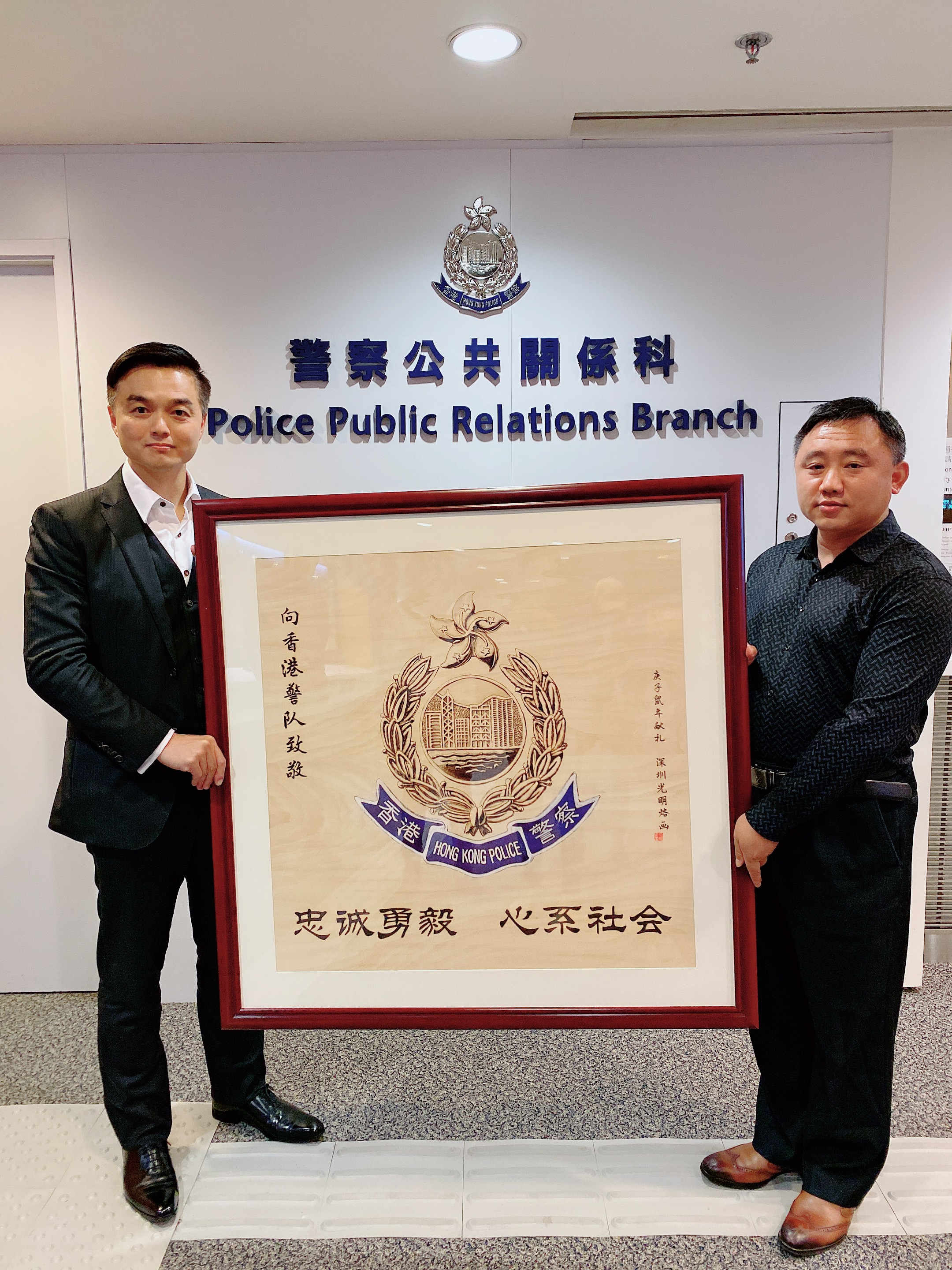 【香港商報網訊】記者 蘇偉 報導:1月17日,臨近春節,深圳光明烙畫基地經過精心策劃,為香港警務處創作了一幅《香港警徽》作品,香港警務處高警司接受慰問作品,並表示感謝烙畫基地此次前來慰問,希望深圳烙畫文化也能夠在香港得到更好傳播和弘揚,為香港員警和市民帶去更多的精神食糧。