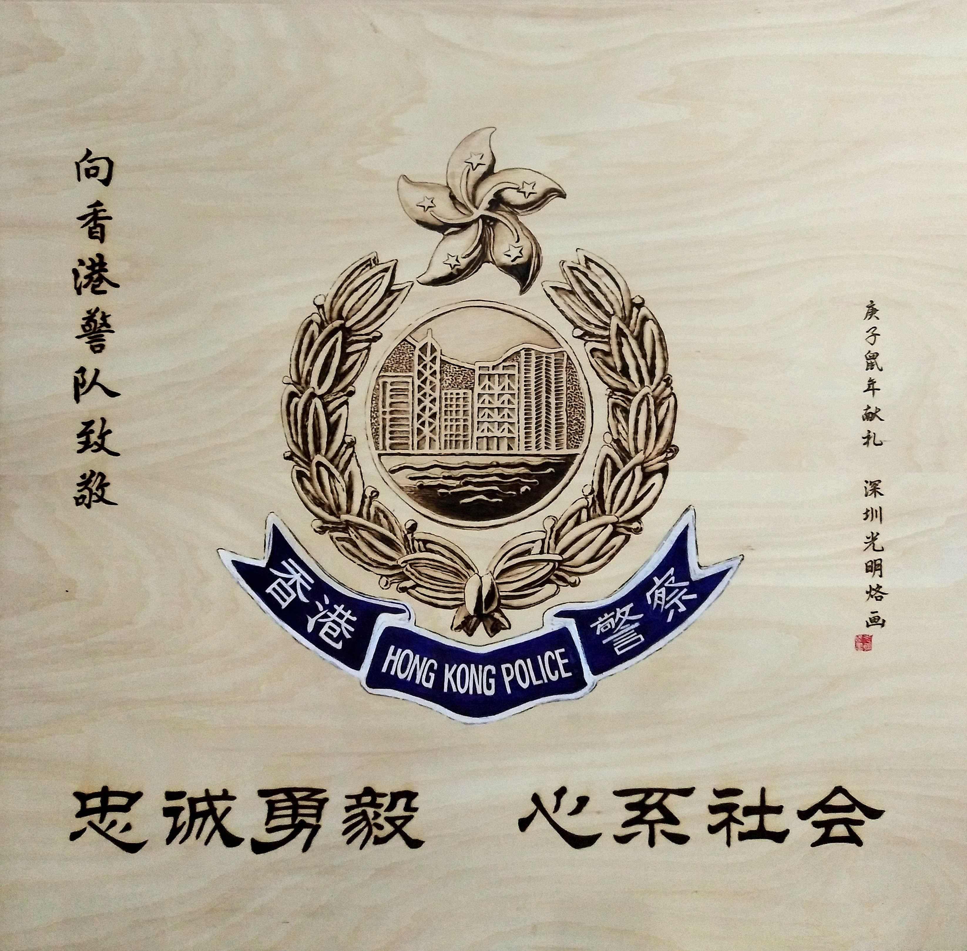 深圳烙畫基地負責人張守福在現場表示,香港員警忠誠勇毅、心系社會,為香港的繁榮昌盛、社會和諧付出諸多努力,衷心感謝香港員警,支持香港員警。據了解,該幅作品是一幅烙畫作品,是用電烙鐵在木板上烙繪製而成。該作品是由深圳烙畫基地大師精心創作,歷時一周時間,特為香港警務處送上的新年祝福!