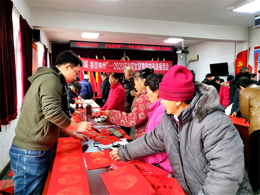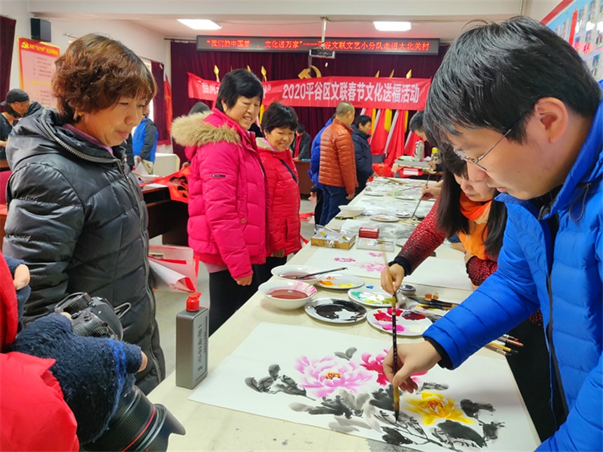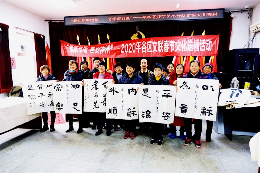 【香港商報網訊】连日来,北京平谷區文聯以「我們的中國夢·文化進萬家」為主題的「福滿京城·春賀神州」——2020平谷區文聯春節文化送福系列活動正式啟動。20餘位文藝志願者走進山東庄鎮大北關村,為村民寫春聯、剪窗花、畫年畫、送福字,並現場為村民書寫20幅家風家訓作品,為村委會贈送了裝裱好的美術和攝影作品。