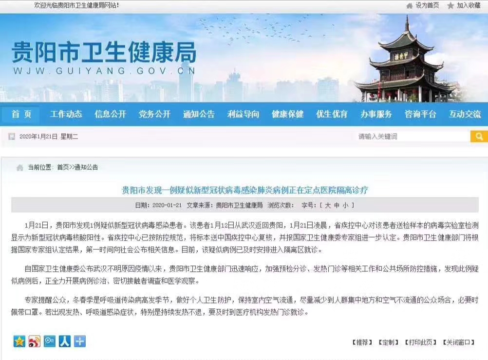 自國家衛生健康委公布武漢不明原因疫情以來,貴陽市衛生健康部門迅速響應,加強預檢分診、發熱門診等相關工作和公共場所防控措施,發現此例疑似病例後,正全力開展病例診治、密切接觸者調查和醫學觀察。