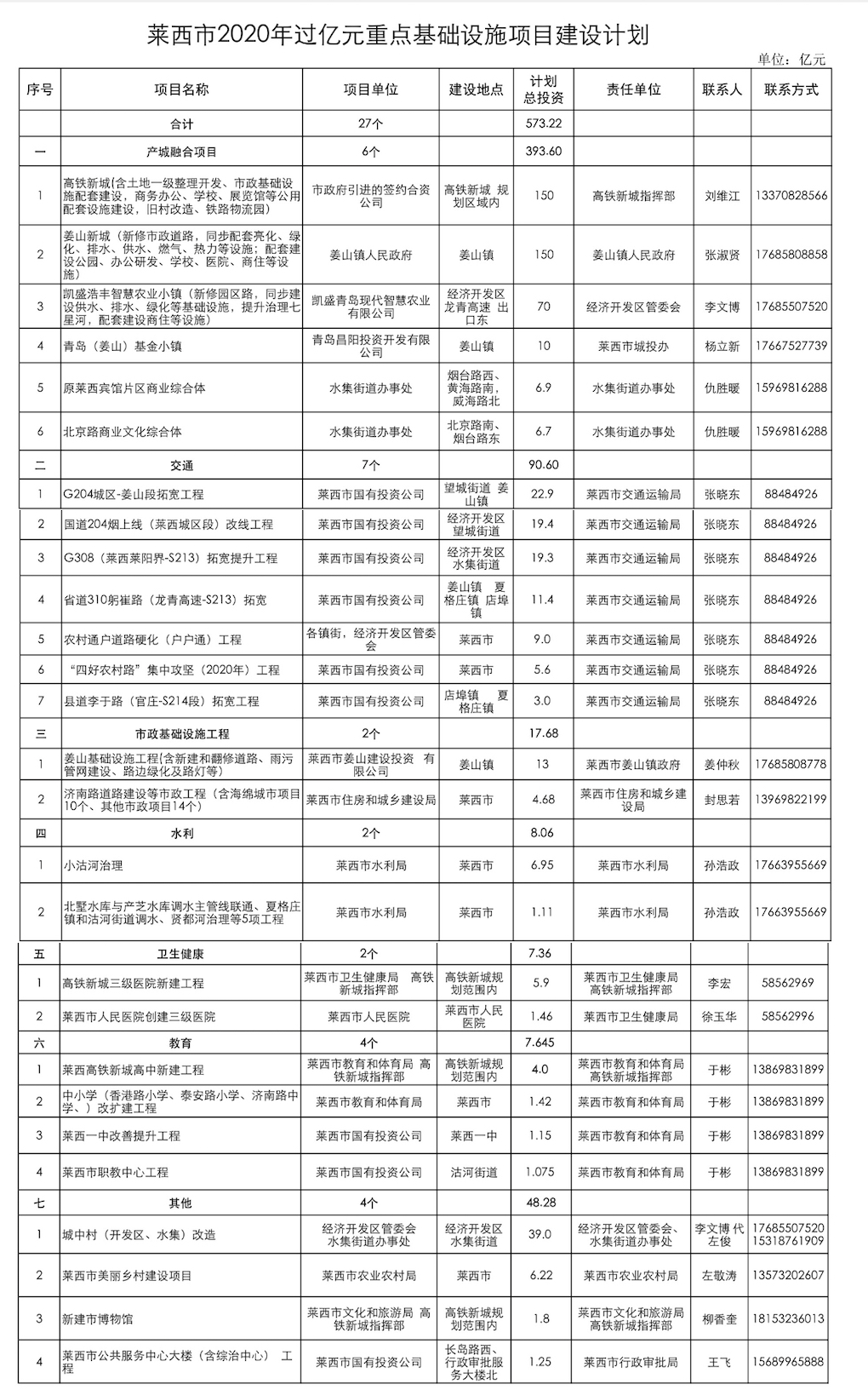 其中,產城融合方面包括高鐵新城建設及姜山新城建設等6個項目,總投資393.6億元;交通方面包括G204城區-姜山段拓寬工程、國道204煙上線(萊西城區段)改線工程、省道310躬崔路(龍青高速—S213)拓寬工程等7個項目,總投資90.6億元;市政基礎設施工程方面涵蓋了姜山基礎設施工程、濟南路道路建設等市政工程共2個項目,總投資17.68億元。還有水利、衛生健康、教育、城中村改造、萊西市美麗鄉村建設等項目,投資額近70多億元。