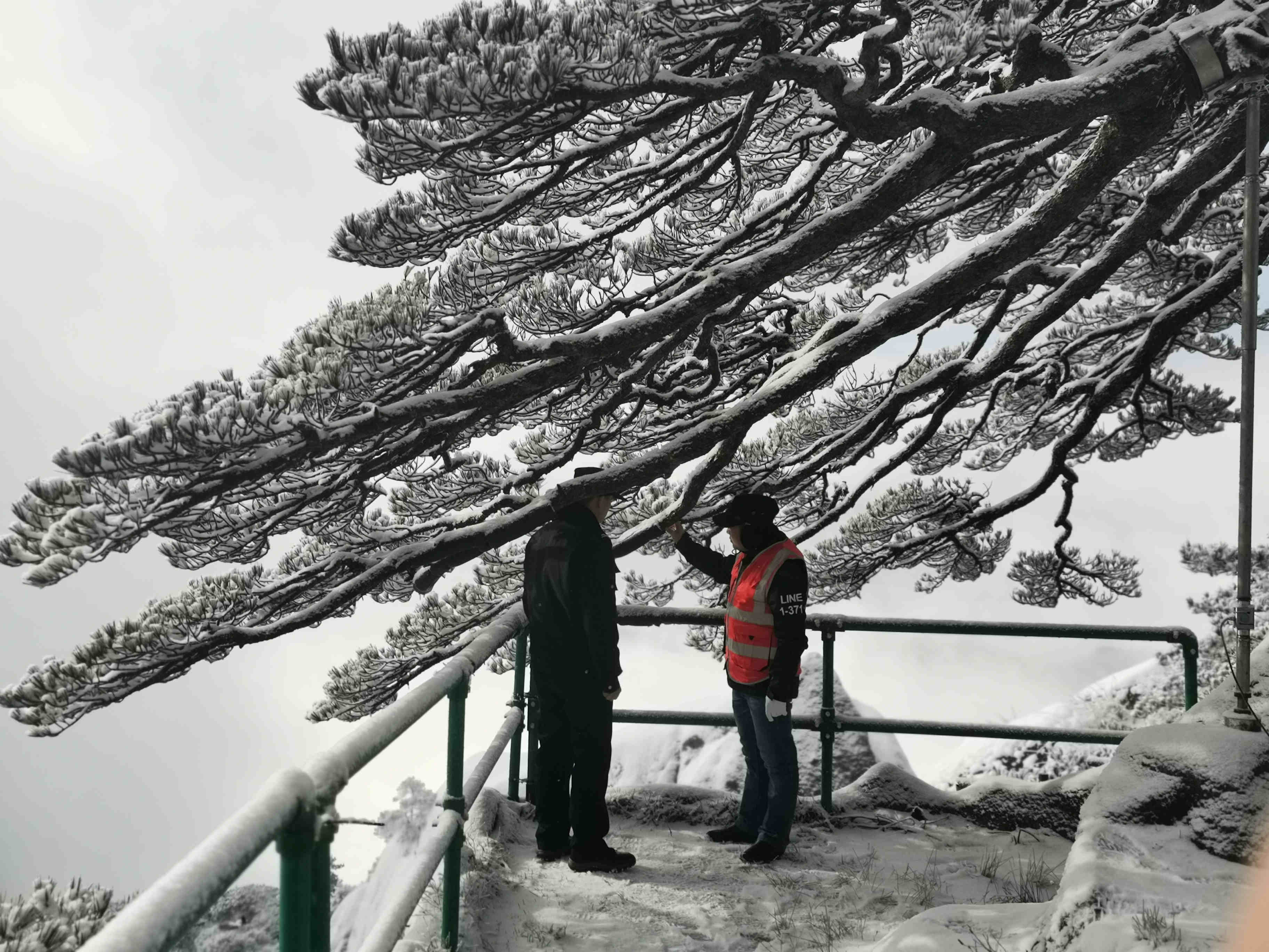1月26日晚上9點,黃山風景區氣象部門發佈暴雪藍色預警信號,景區立刻啟動古樹名木暴雪天氣Ⅳ應急回應,按照古樹名木“一樹一策”方案,各管理區古樹名木小分隊加強巡護,樹長和技術人員現場支援,定時觀察樹體和支撐、拉纖等保護措施效果,部分積雪嚴重的古樹名木實施人工抖雪緩解樹體積雪載荷。國寶迎客松嚴格落實24小時守護制度。