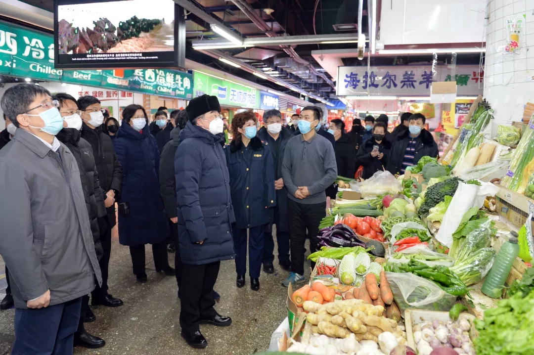 革新街菜市場內商品齊全,秩序井然。張慶偉詳細查看各種蔬菜、肉類等商品價格,詢問近期是否漲價、供應是否充足等,對經營業戶節日期間正常經營、方便群眾生活給予肯定,他叮囑有關部門負責同志在疫情防控的非常時期,要保持物價穩定,保障供應充足,加強市場監管和衛生管理,切實滿足人民群眾基本生活需求。